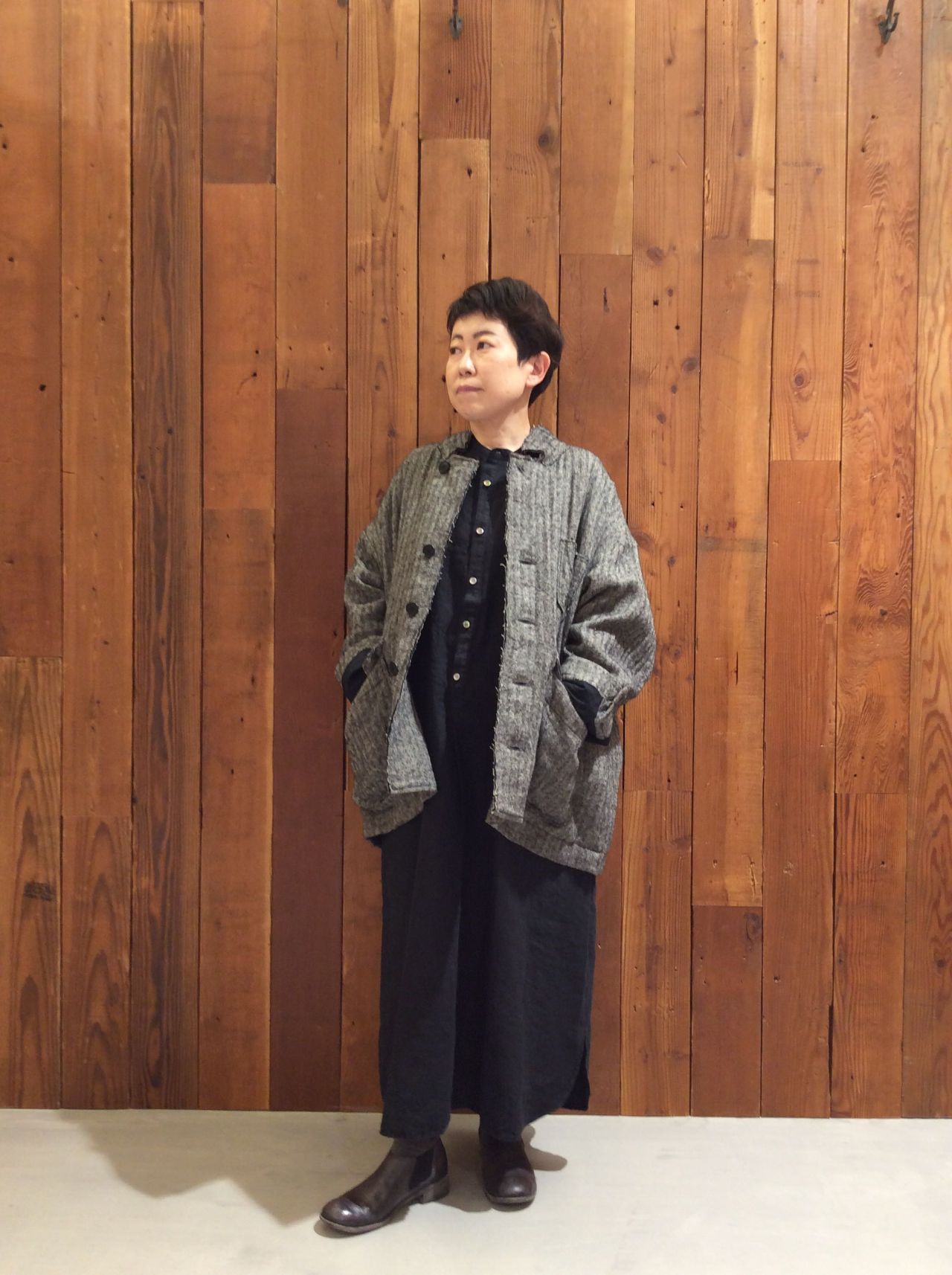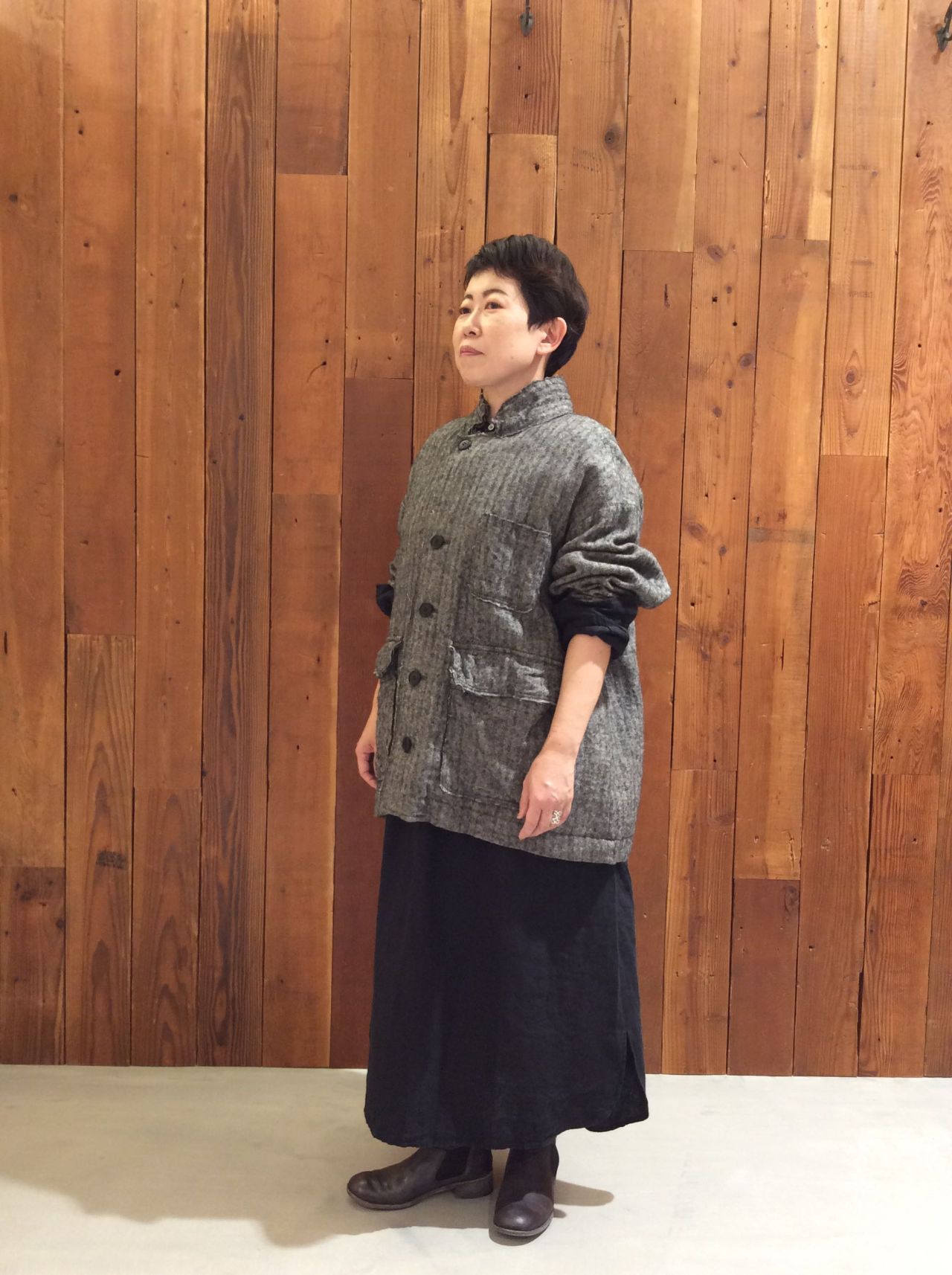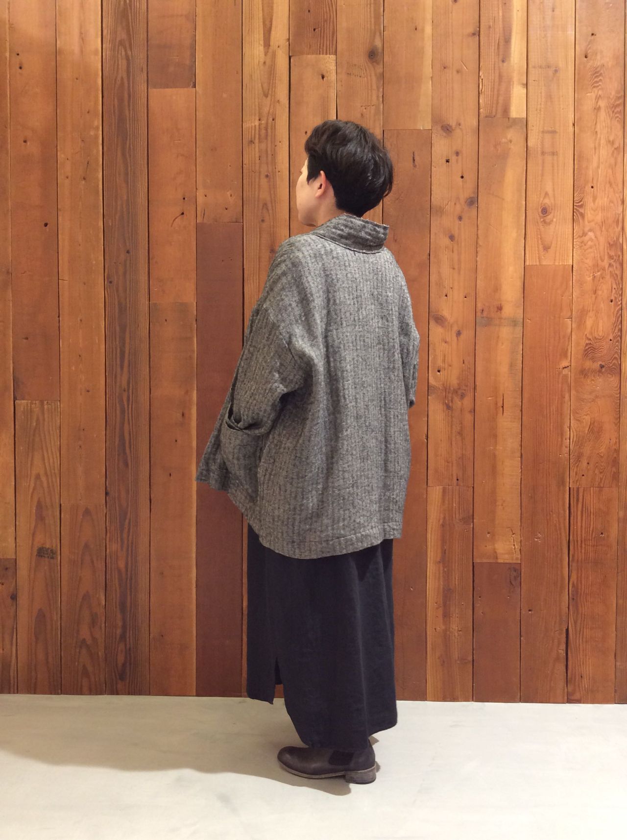 仕上げには洗いをかけ、ウールとリネンの縮み方の違いでできる凸凹感を出し、断ち切り仕様の襟やポケットで抜け感を出したパドカレらしい1枚です。