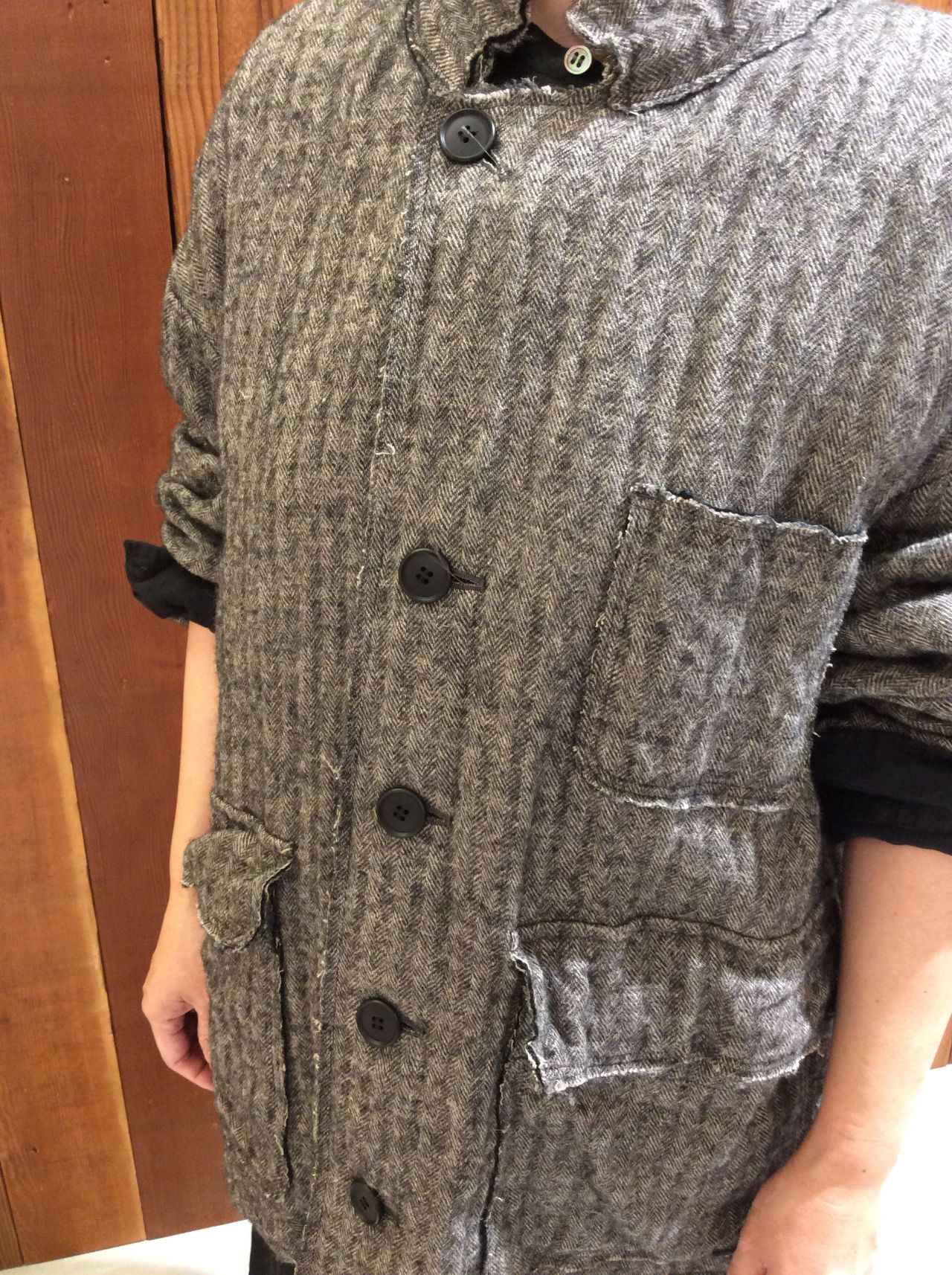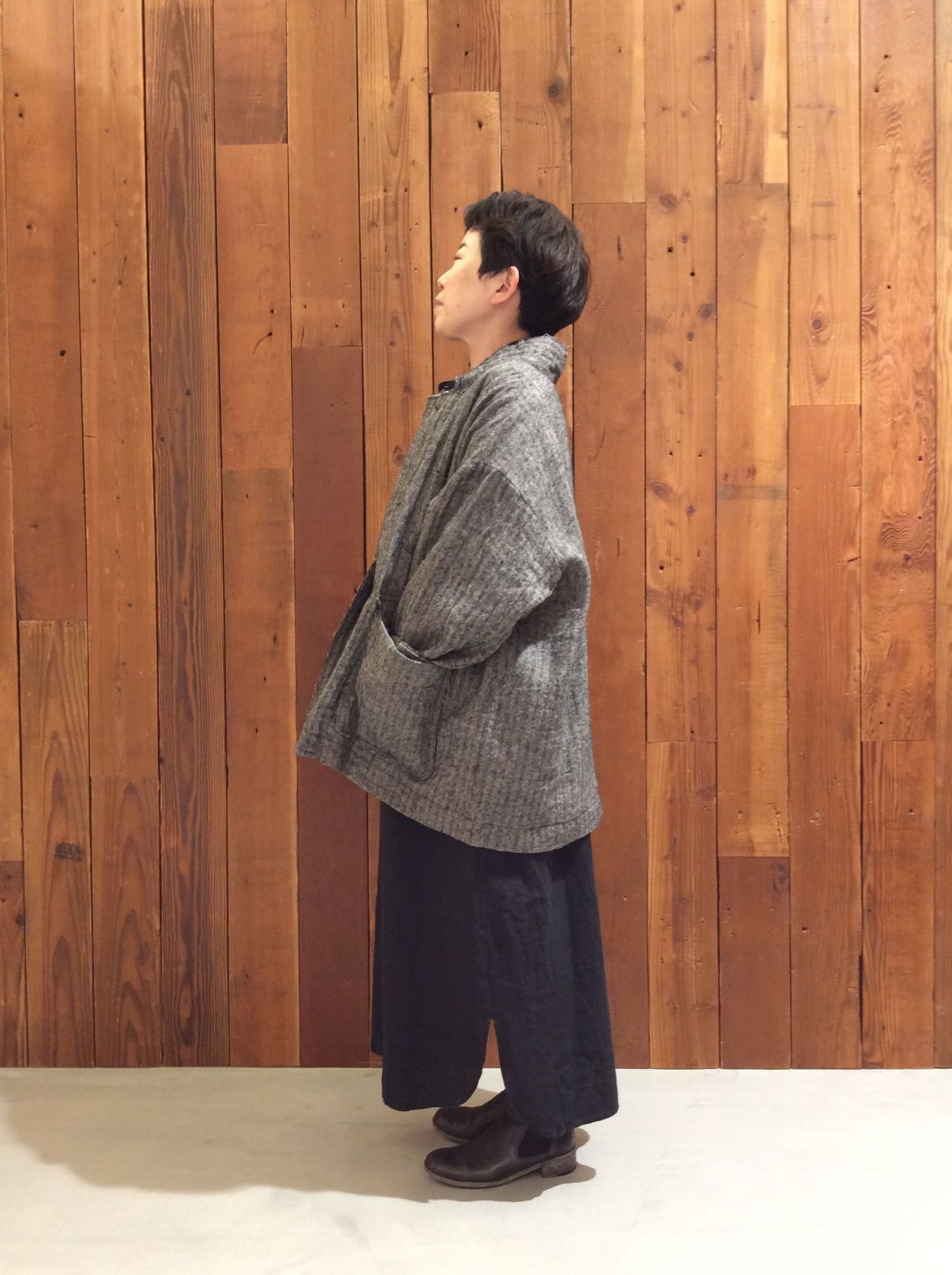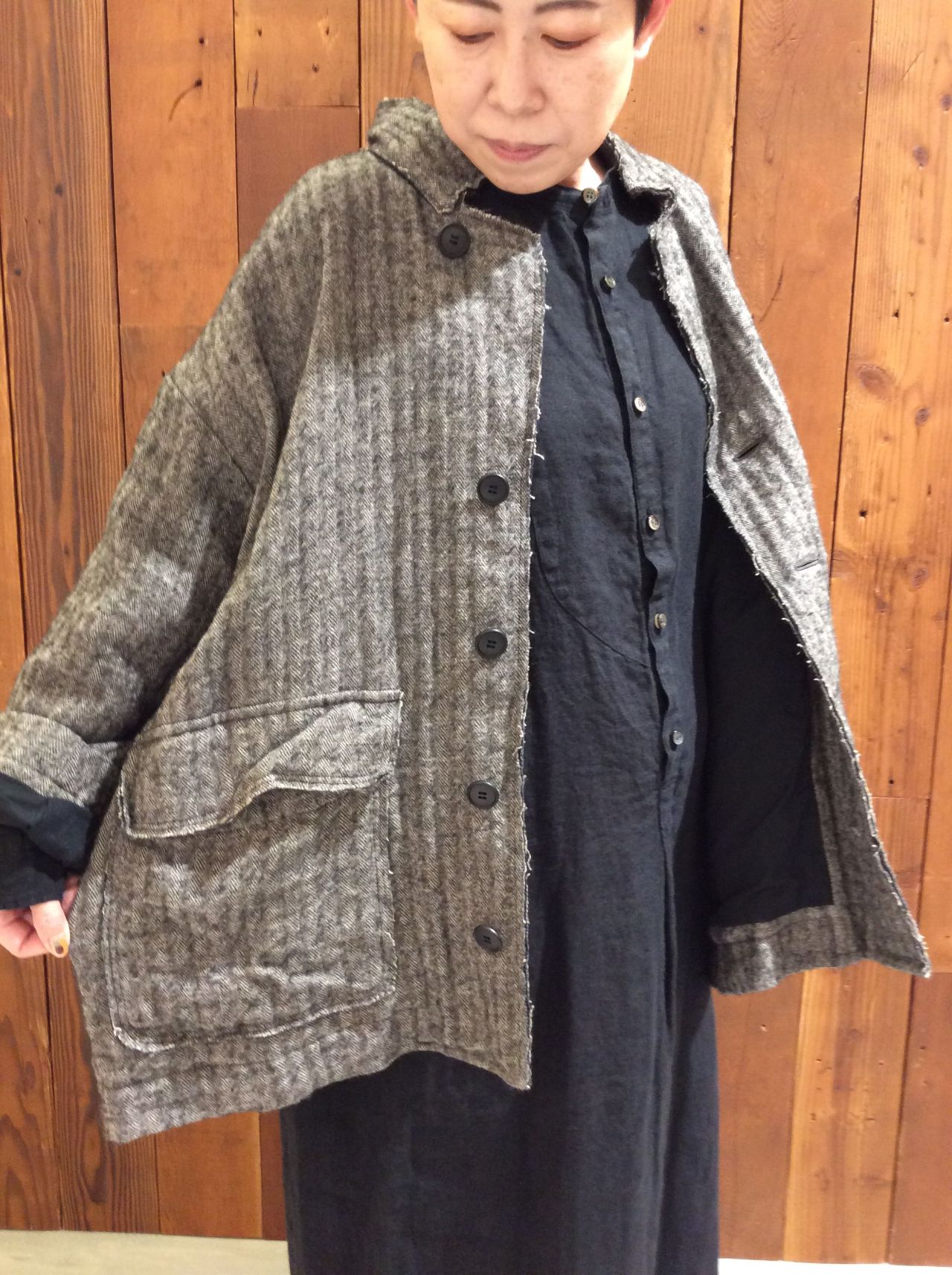 仕上げには洗いをかけ、ウールとリネンの縮み方の違いでできる凸凹感を出し、断ち切り仕様の襟やポケットで抜け感を出したパドカレらしい1枚です。