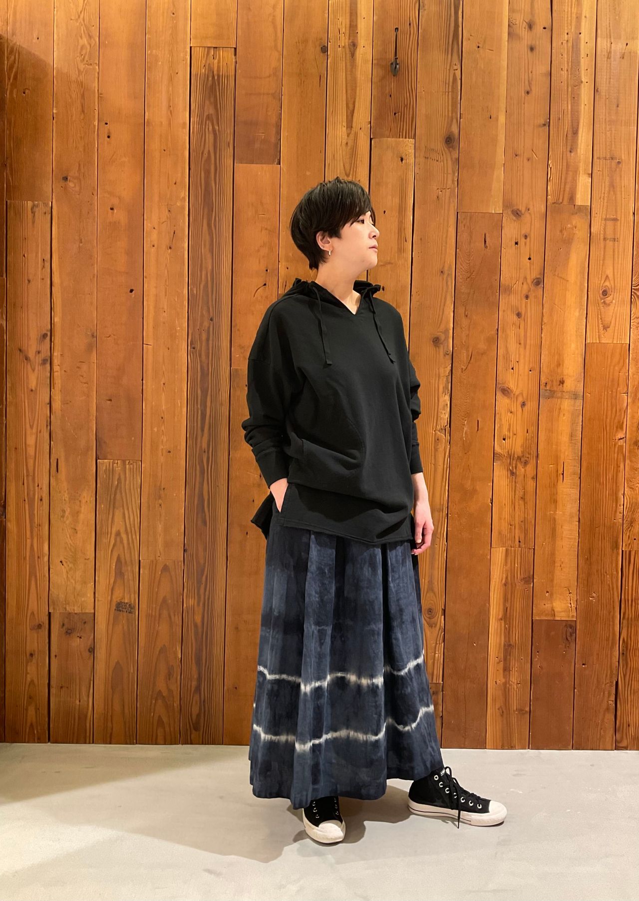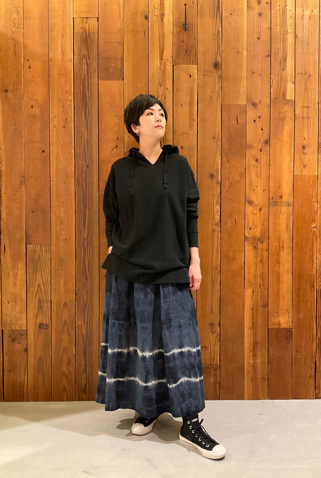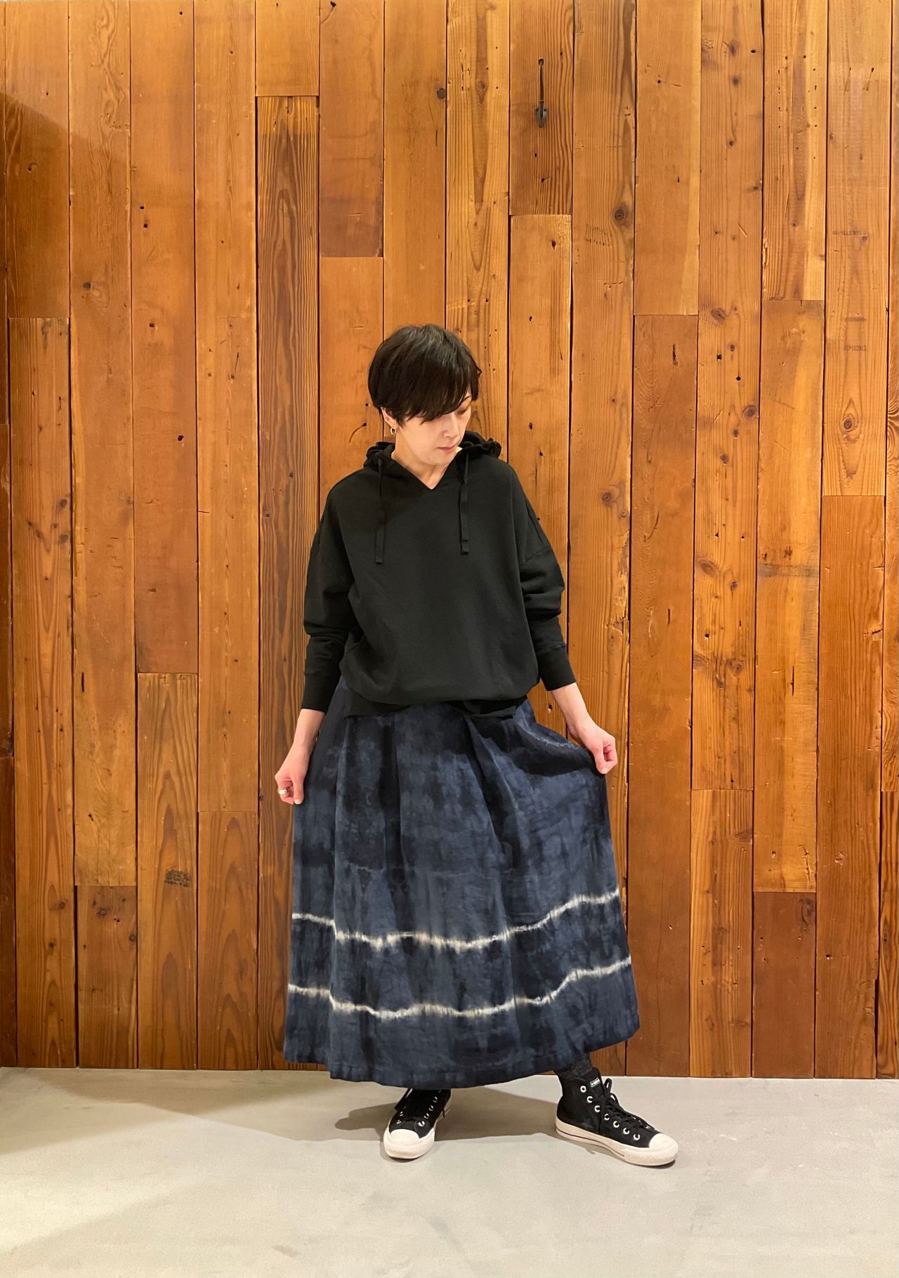 同シリーズのスカートは、前ウエストにタックを斜めに入れ、ウエストがすっきり見えますよ。