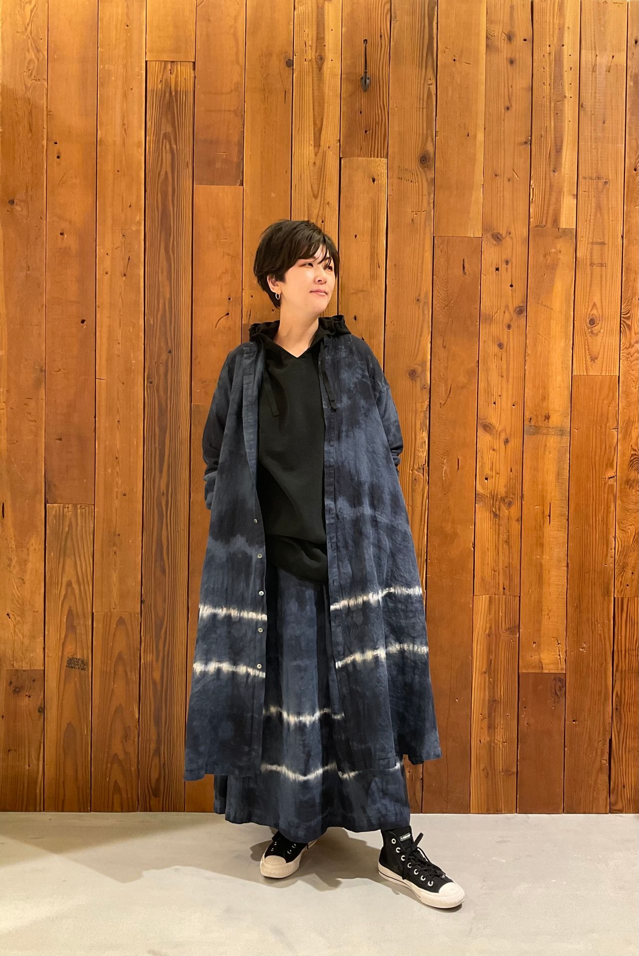 肩周りはすっきり、裾に向かって贅沢に生地を使いボリュームを出したAラインのシルエットが独特の柄をさらに引き立ててくれます。