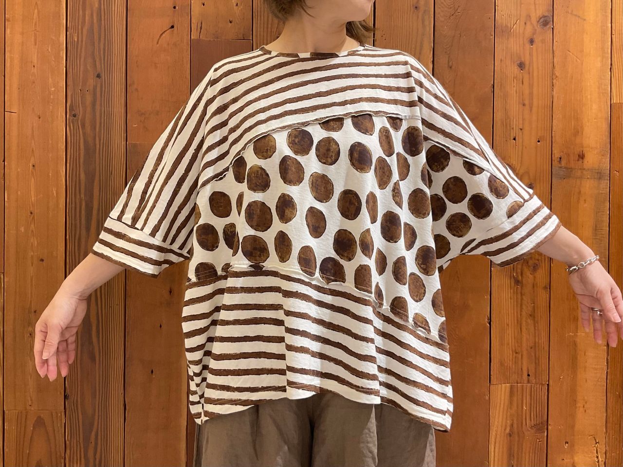 ドットとボーダーのプリント生地を接ぎ合わせた綿100%カットソー。