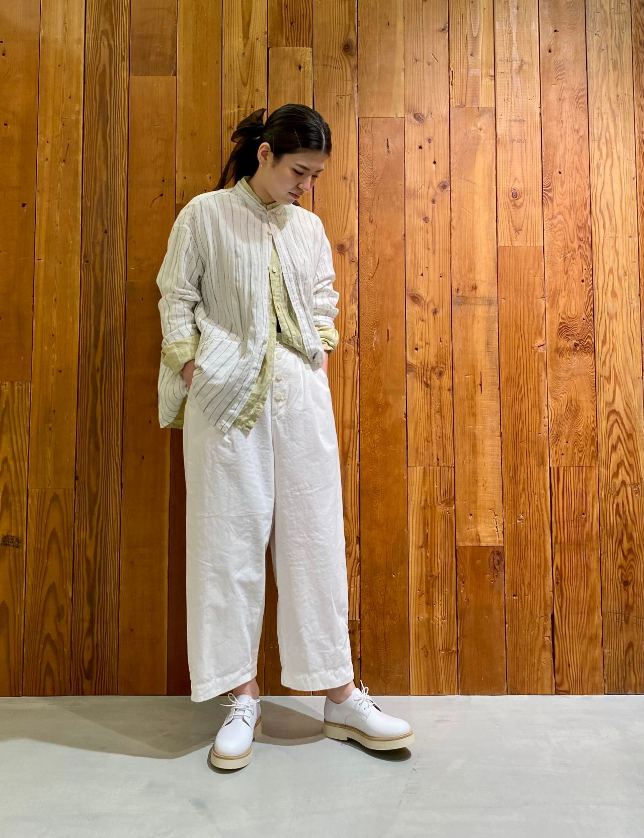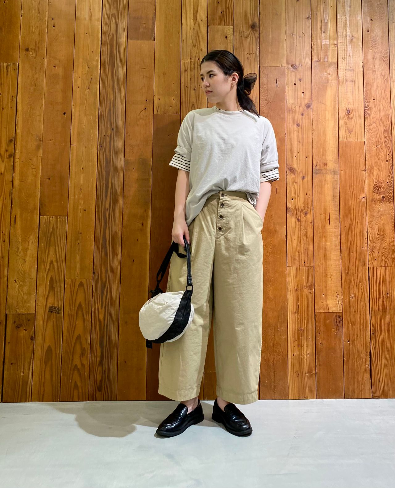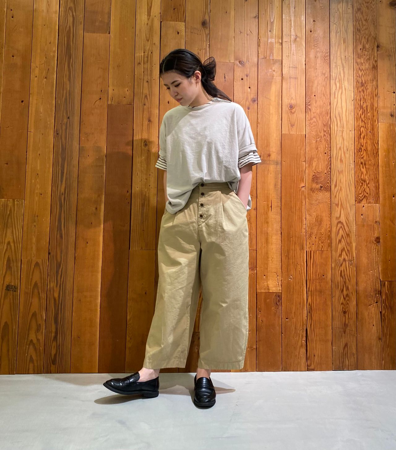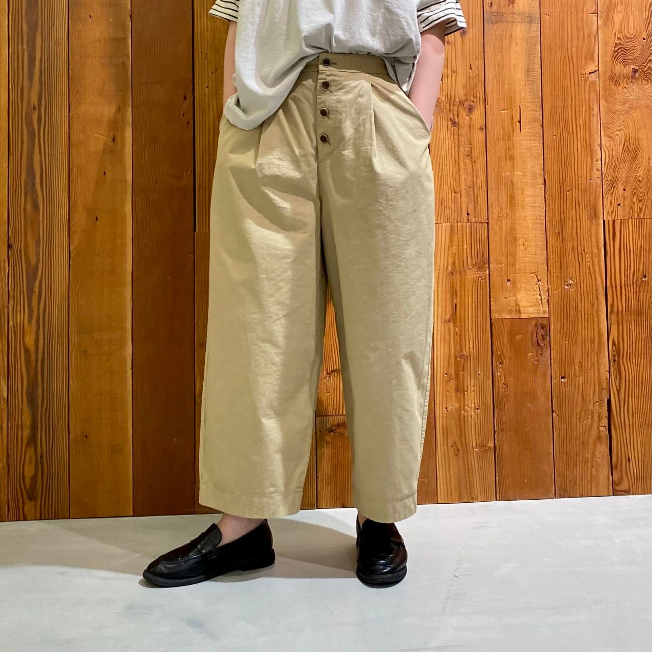 フロントの4つのボタンがアクセントのクロップパンツ。