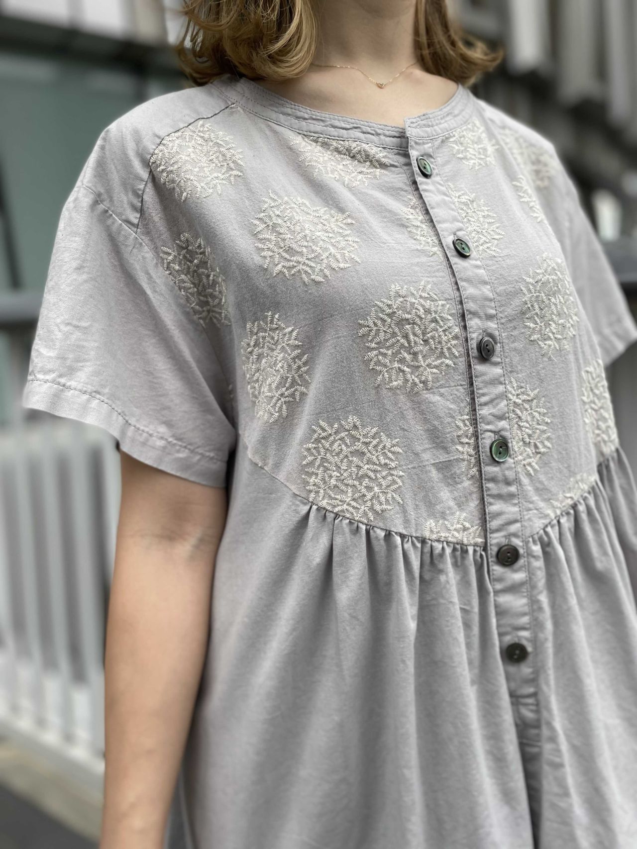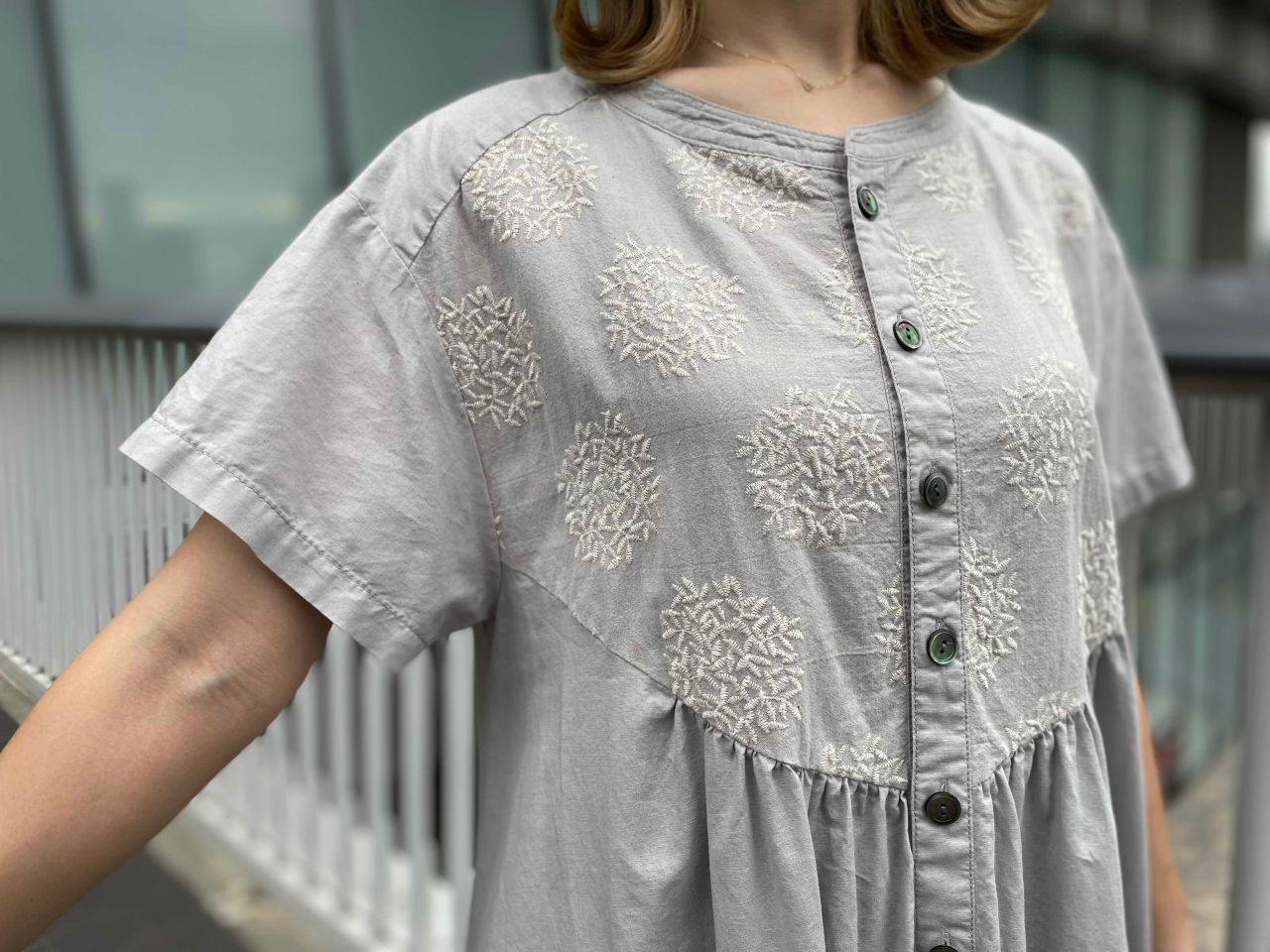 胸元は大きめの葉柄をモチーフに刺繍を施していて、一枚でもコーディネートがさまになります。