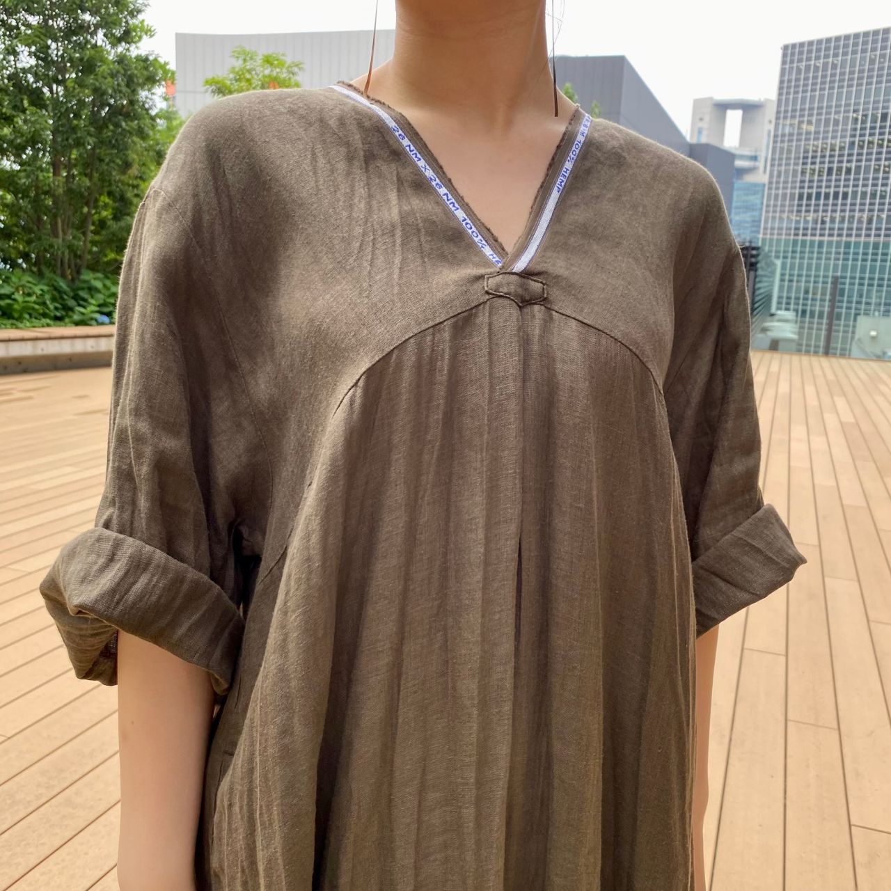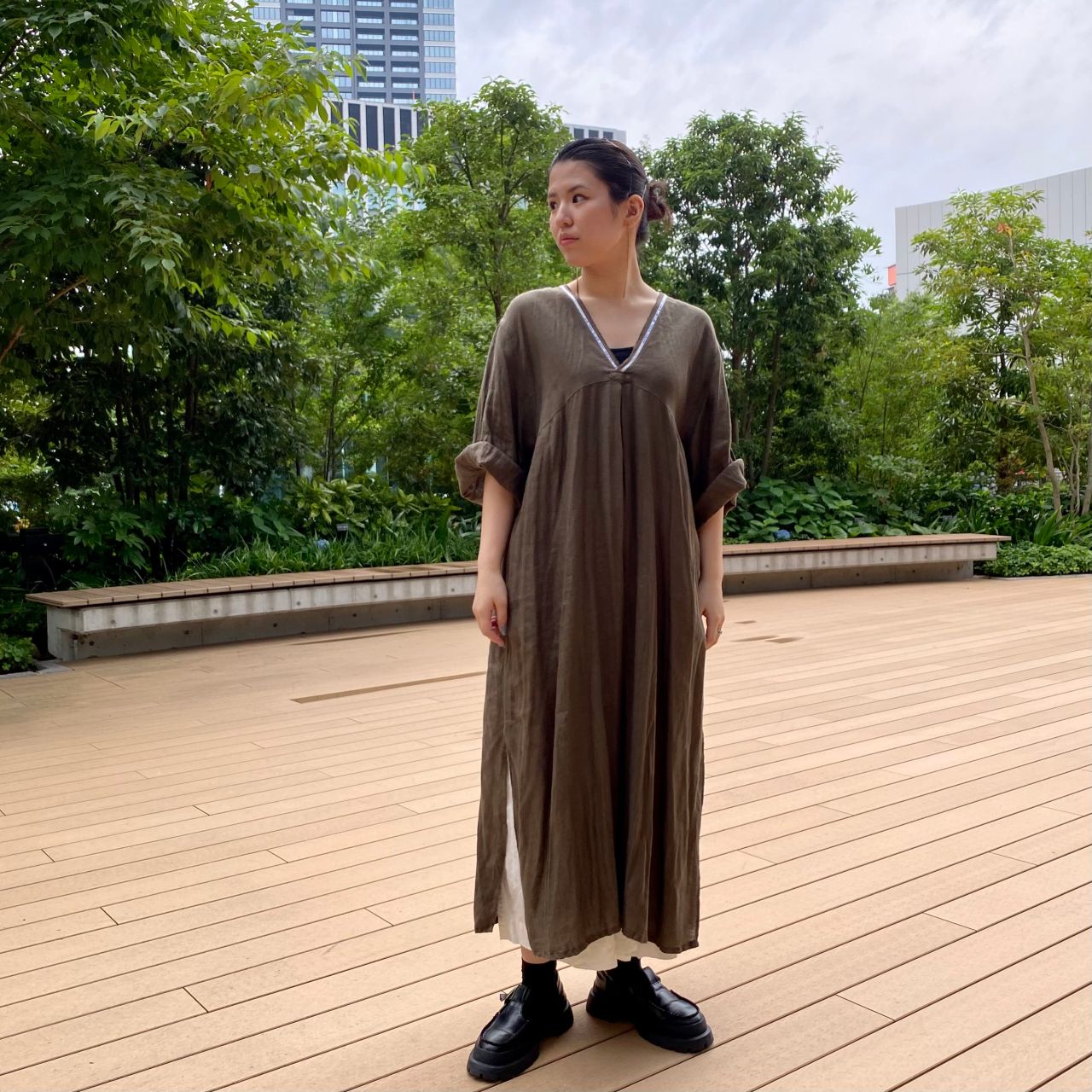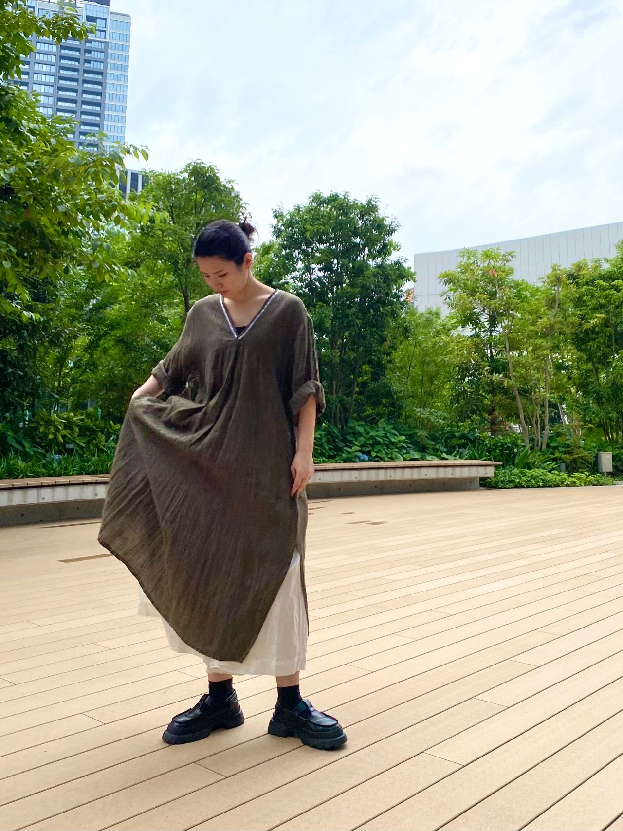 センターフロントに施されたプリーツにAラインのシルエットに、ヘンプに持つ自然な光沢がプラスされ