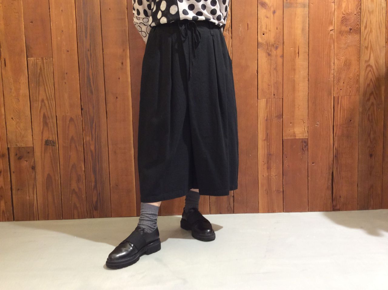 ウエストは左上に畳んで紐を結び、巻きスカートのようにも見えるボリュームのあるデザインです。