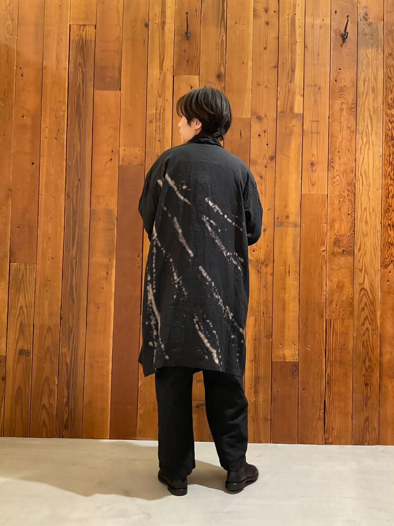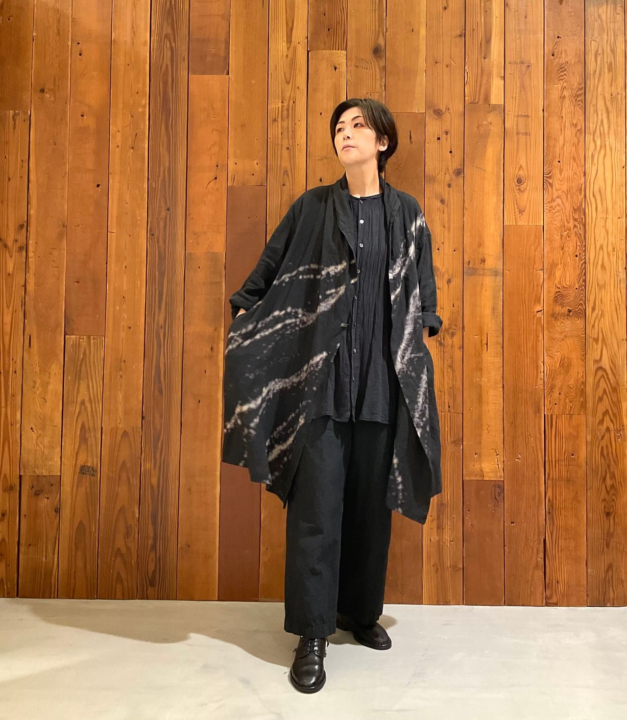 ダイナミックな柄が印象的なリネン素材のコート。
