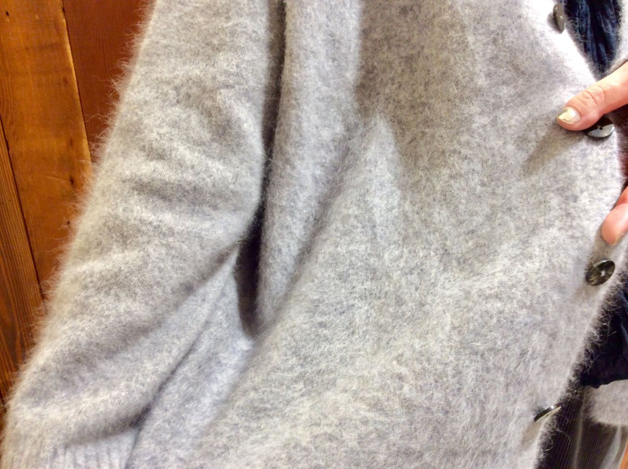 ふわっと柔らかな肌触りやさしく包み込まれるような、ラクーン100%のカーディガン。