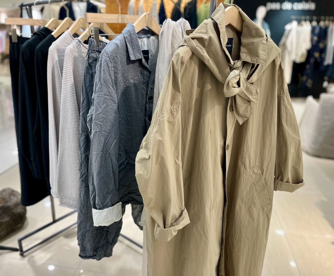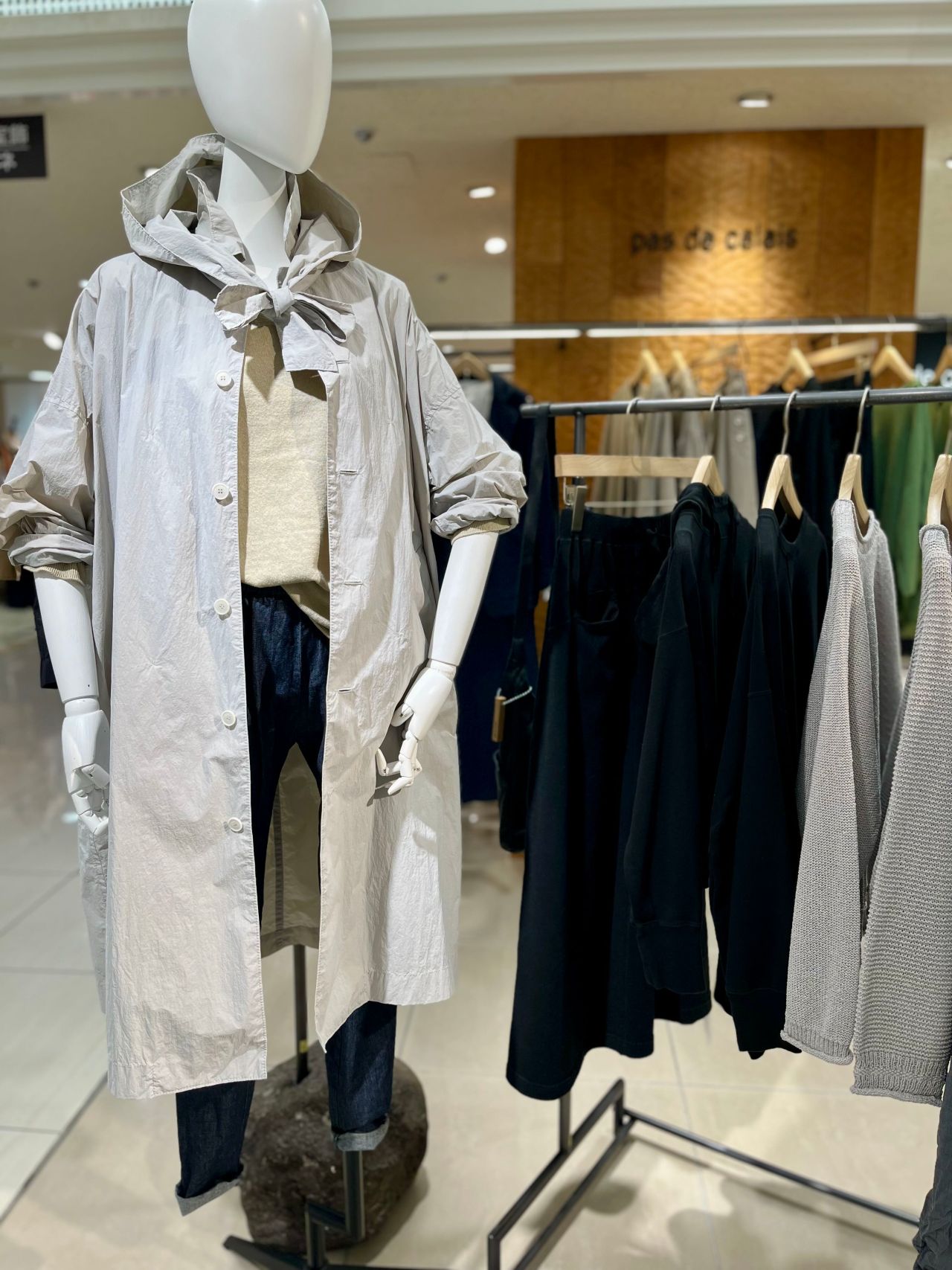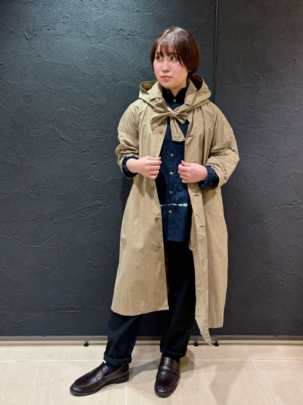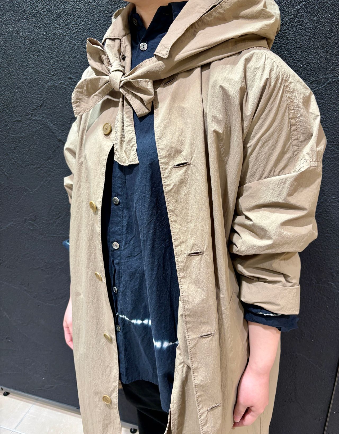 スカーフ風フード付きのステンカラーコート。