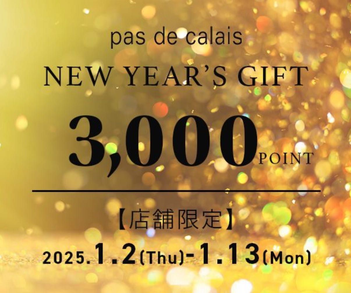 1月3日(金)〜13日(祝月)の期間中、パドカレからのNEW YEAR'S GIFTとして、公式アプリダウンロード、税込33,000円以上ご購入で、その場で使える3000ポイントをプレゼントいたします。