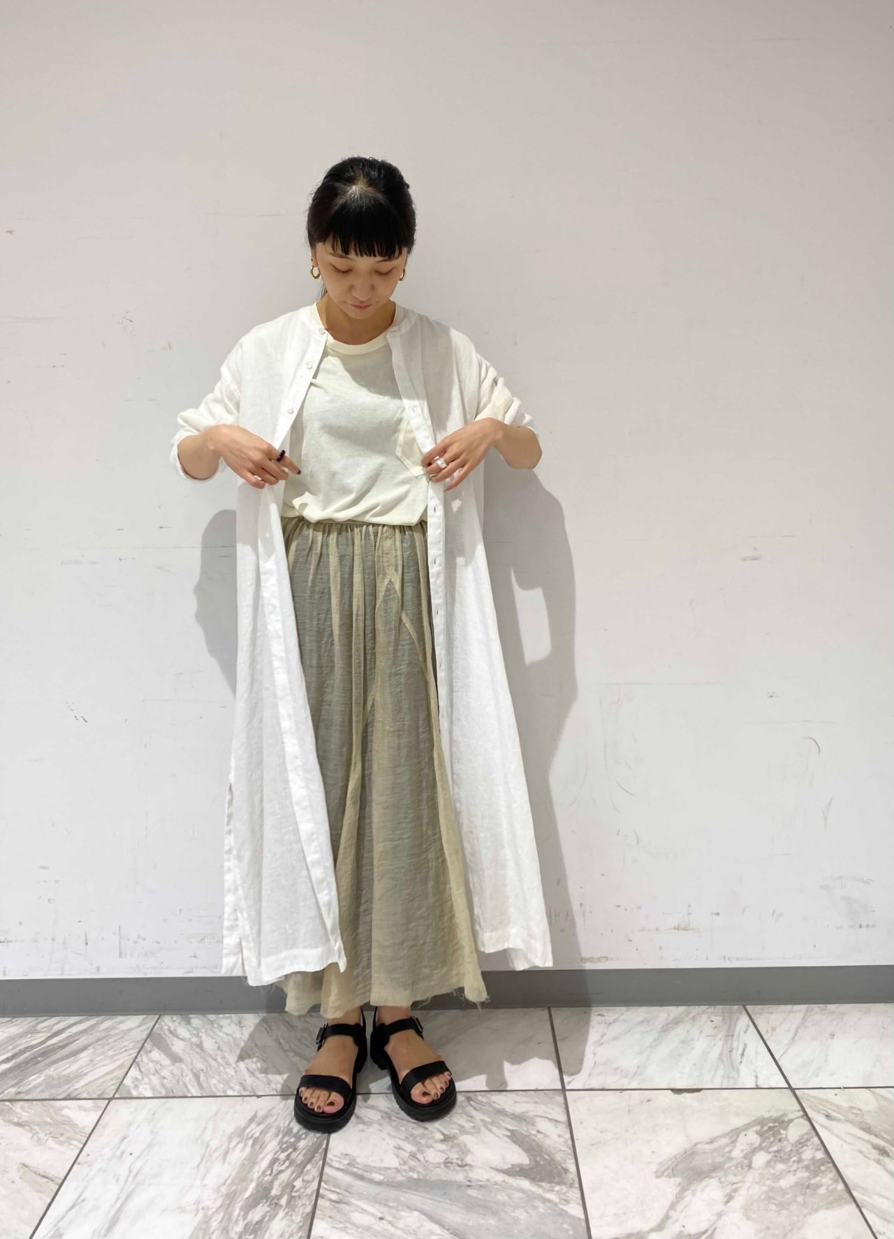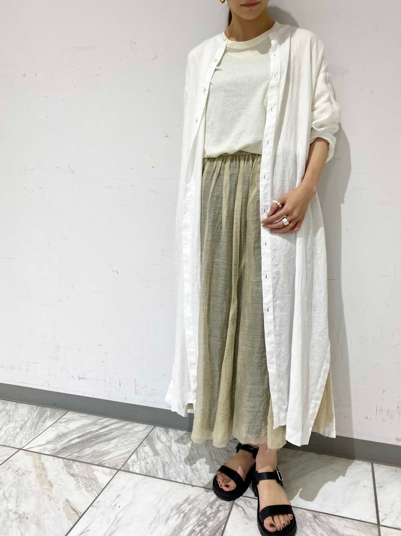 シンプルなデザインのワンピースは羽織りとしても着まわせる万能アイテム。