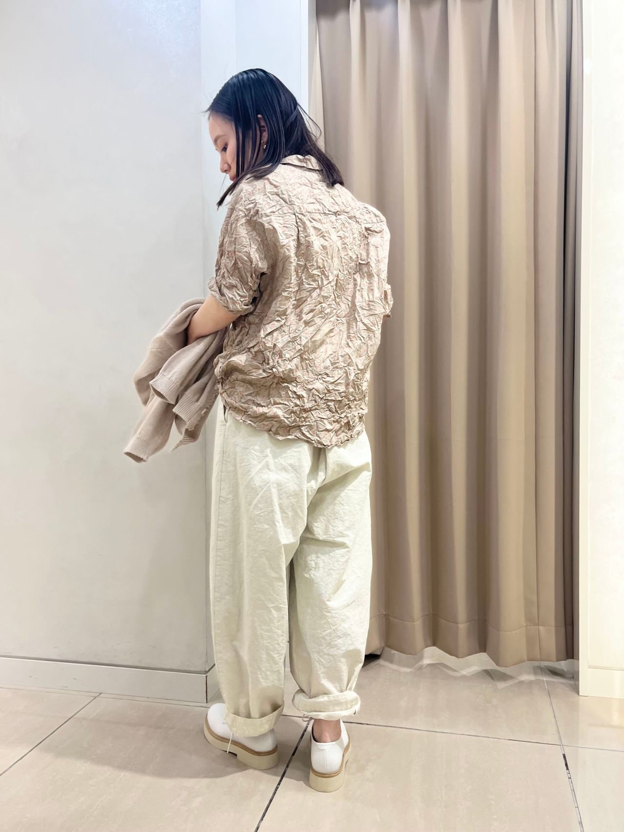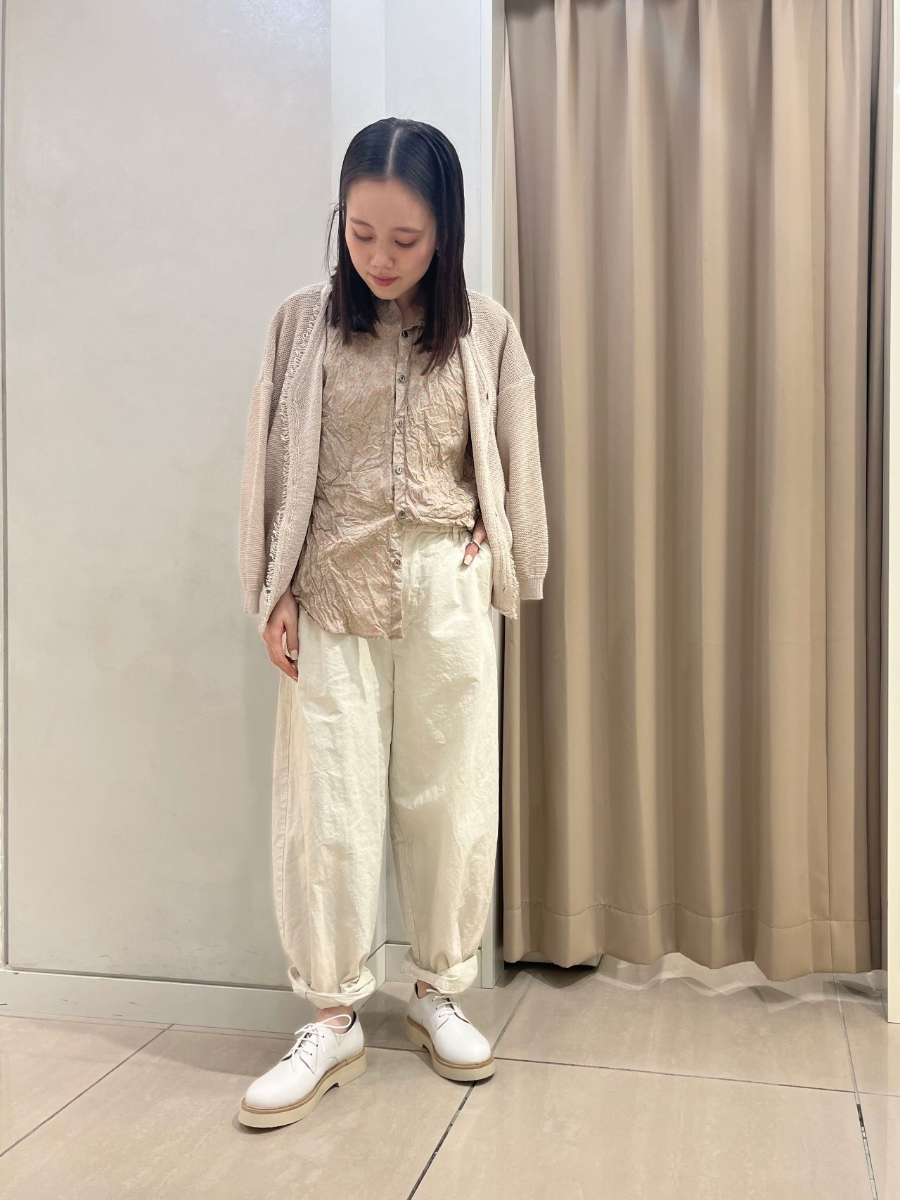 ピンクベージュのブラウスを主役に、ワントーンでまとめた春を感じるコーディネート。