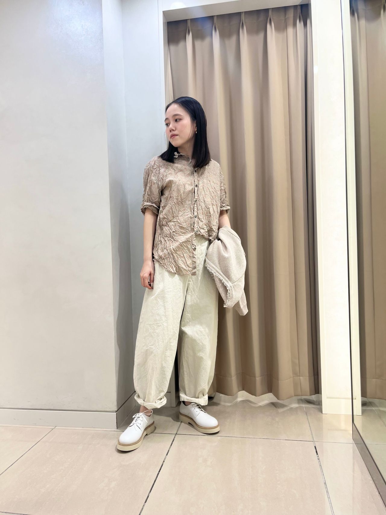 足元はパンツをロールアップし、レザーシューズを合わせることでマニッシュな印象に。