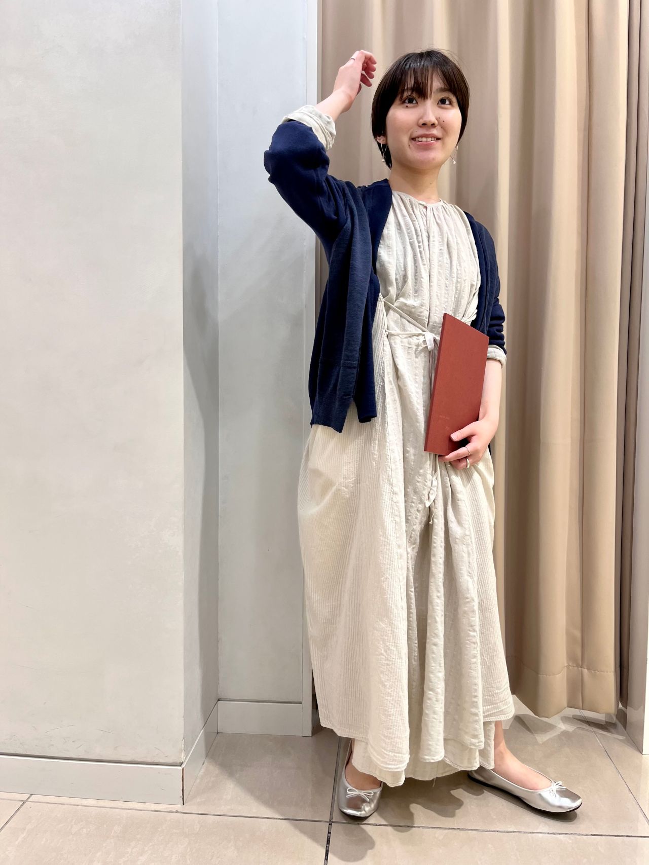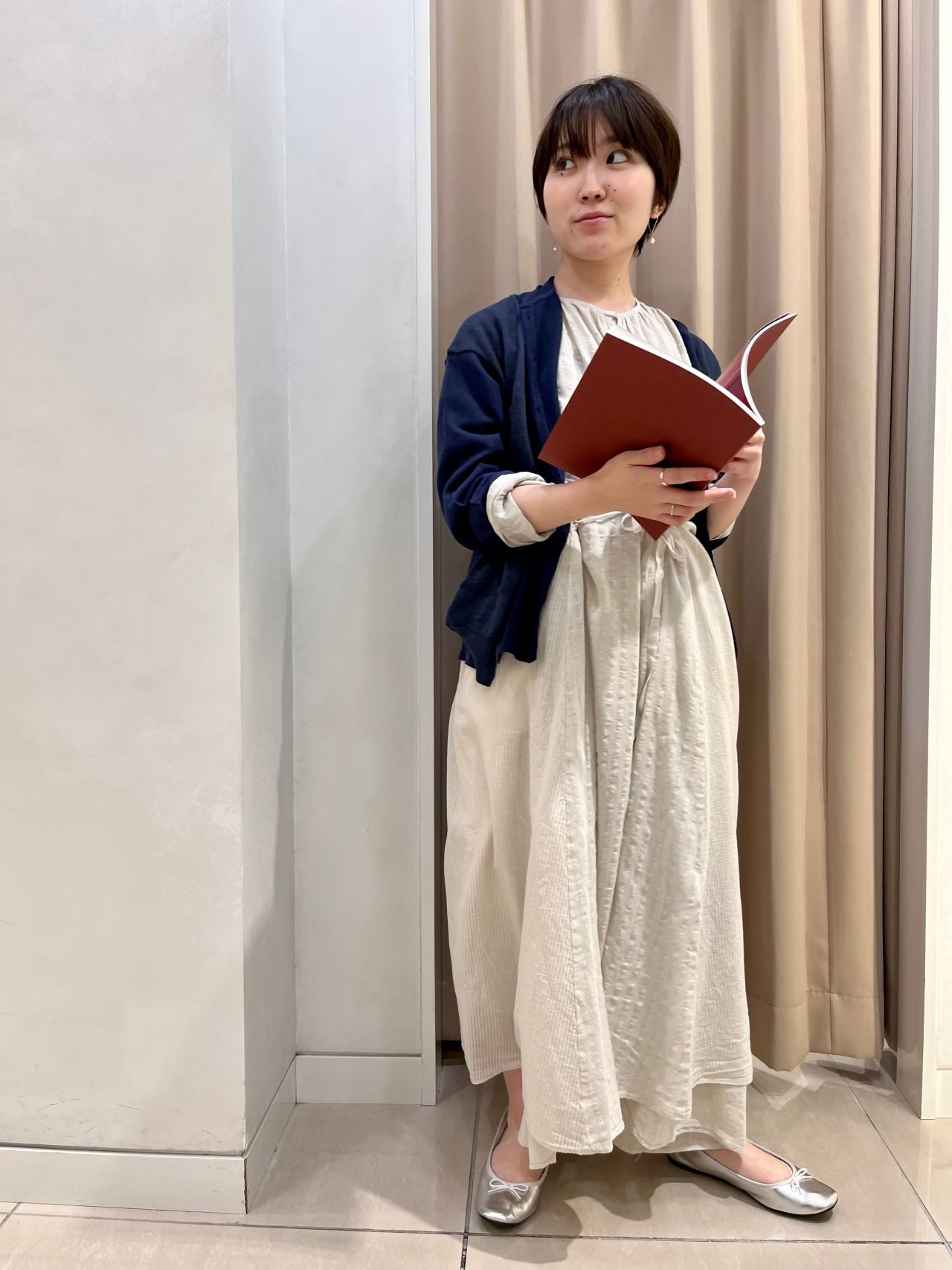 ふんわりした風合いが特徴のワンピースに、リネンのシャリ感があるカーディガンを合わせたナチュラルなコーディネート。