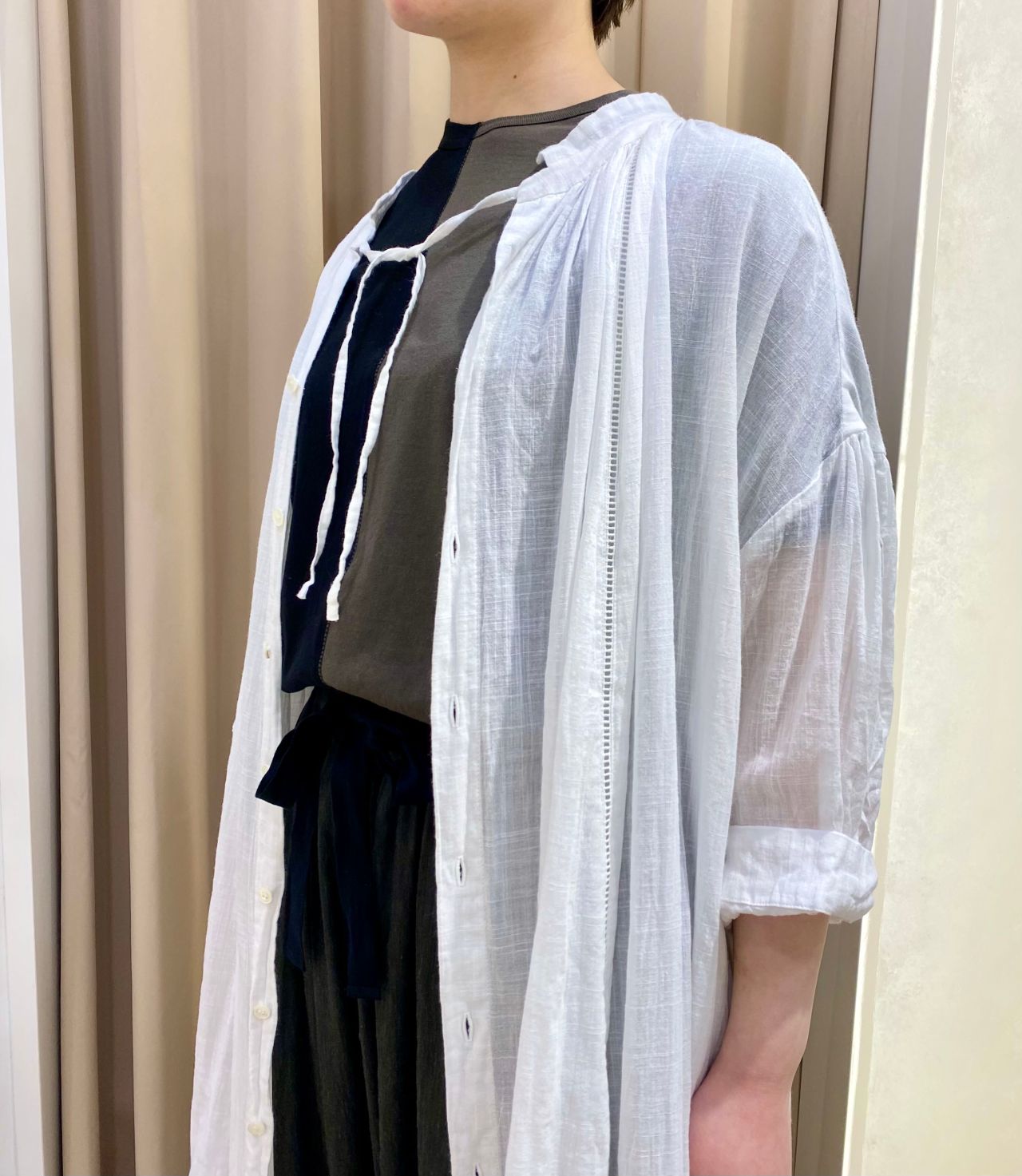 羽織には袖口に適度なボリューム感のあるギャザーワンピースを合わせ、
