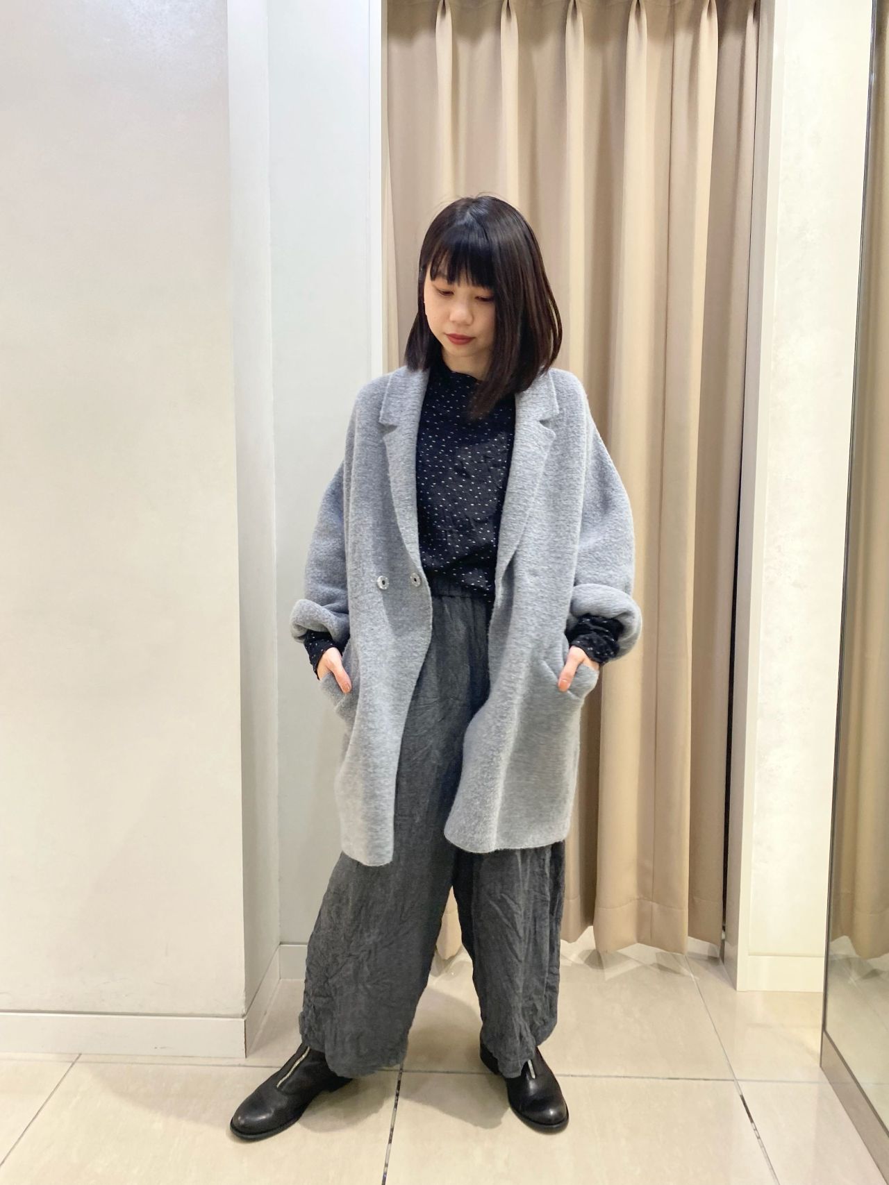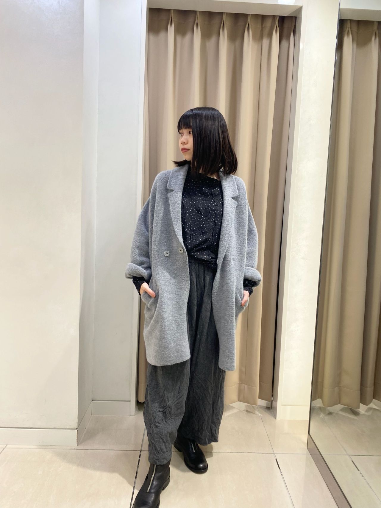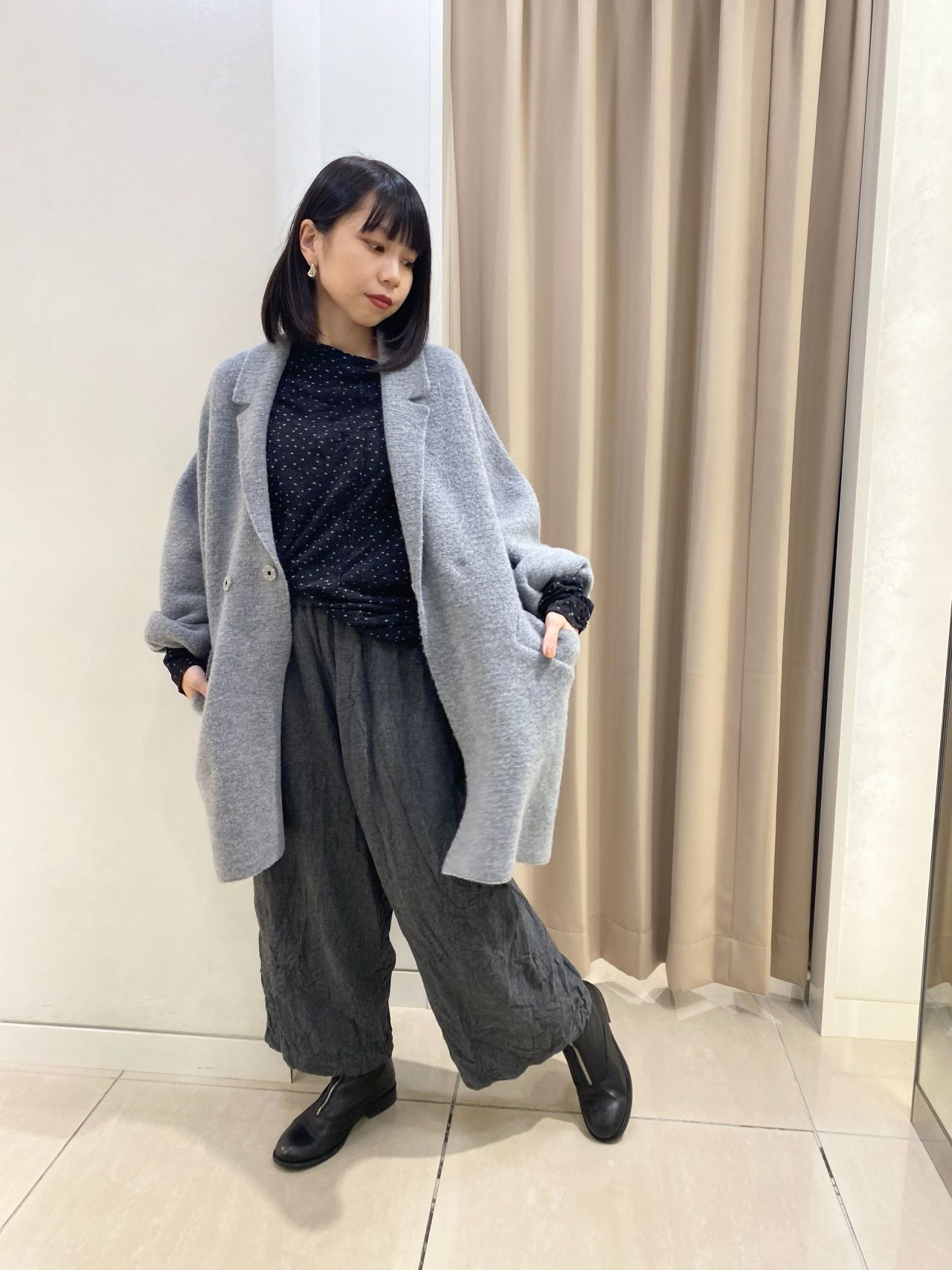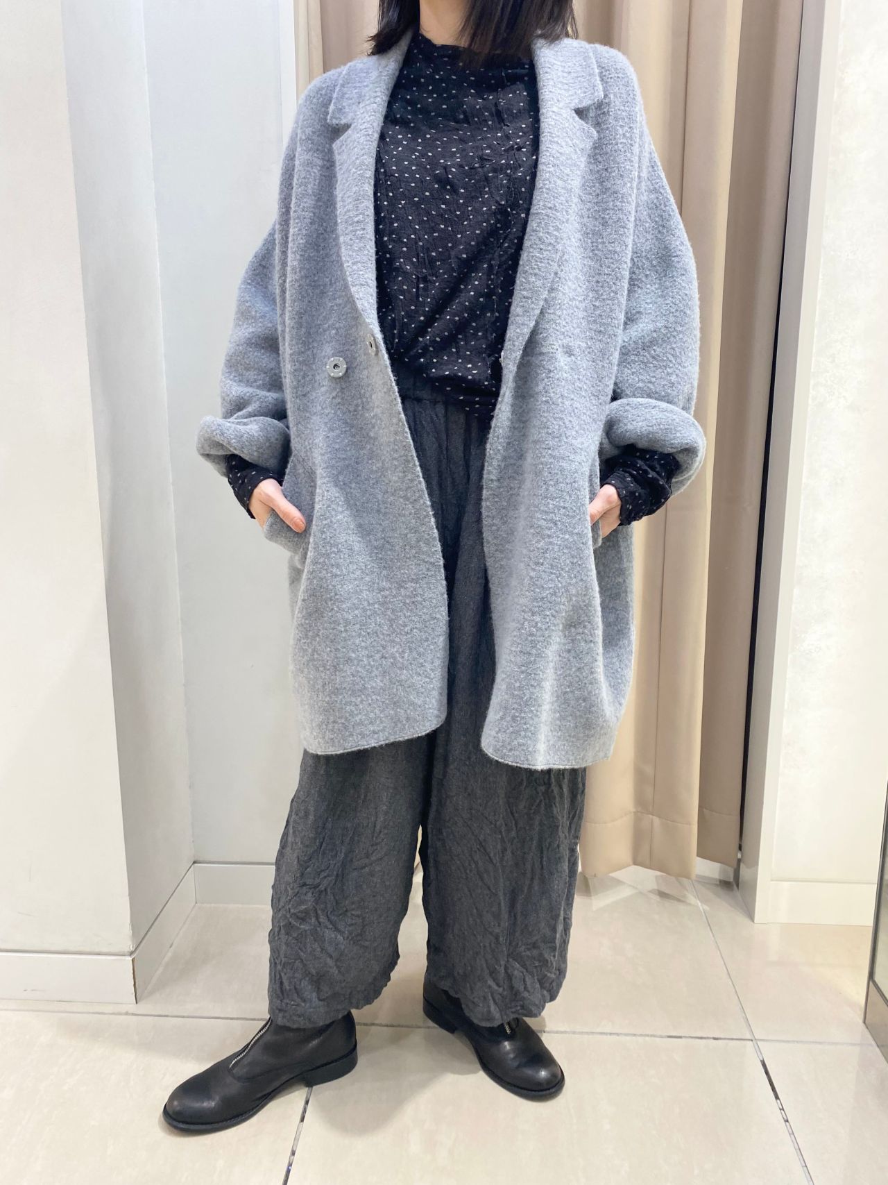 ソフトでふっくらとした生地感が心地良いホールガーメントニットジャケットに、ゆとりのあるガウチョパンツを合わせ、色味はグレートーンで統一。