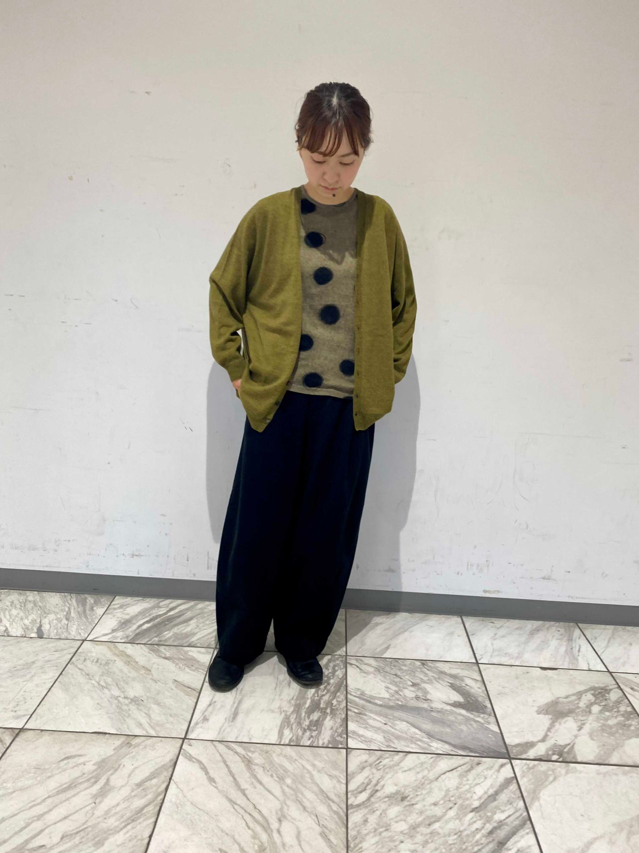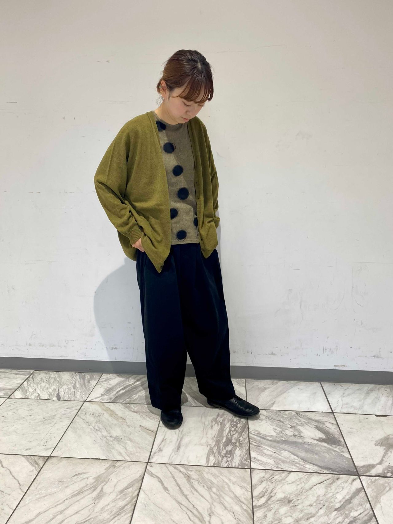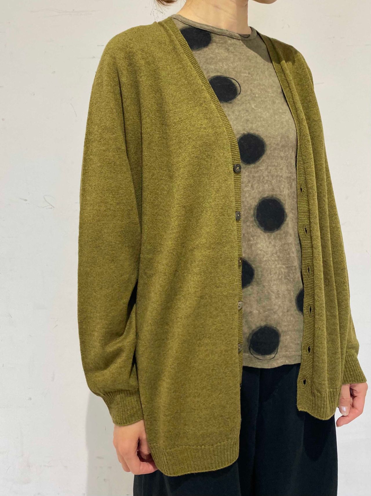 石や植物の持つ力を使用した染めを施したカーディガンを使い、一足早く秋の装いに。