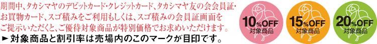 期間中、髙島屋カード・友の会カードでお買い物頂くと店内商品10%OFFでお求めいただけます。