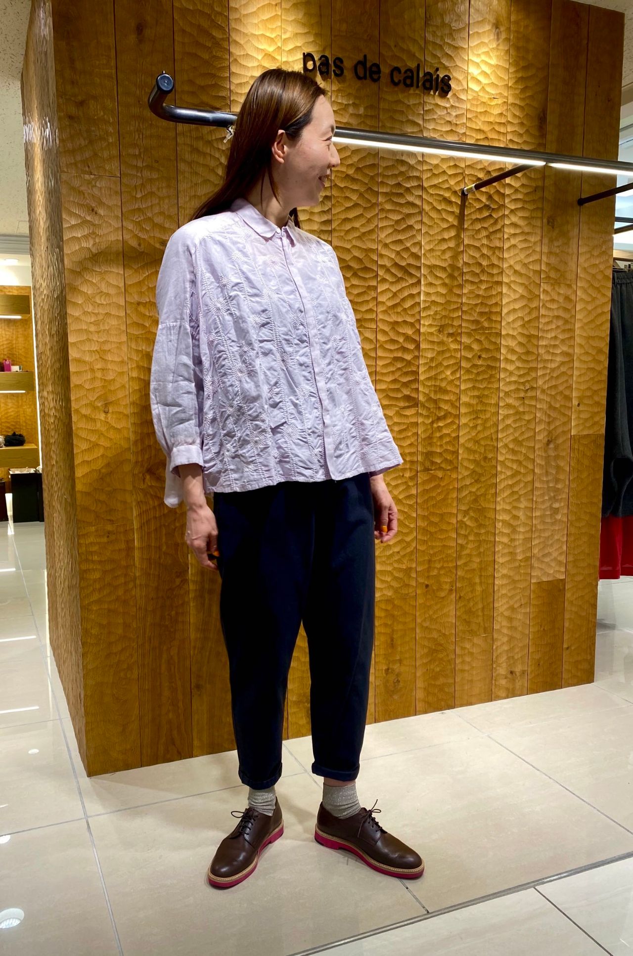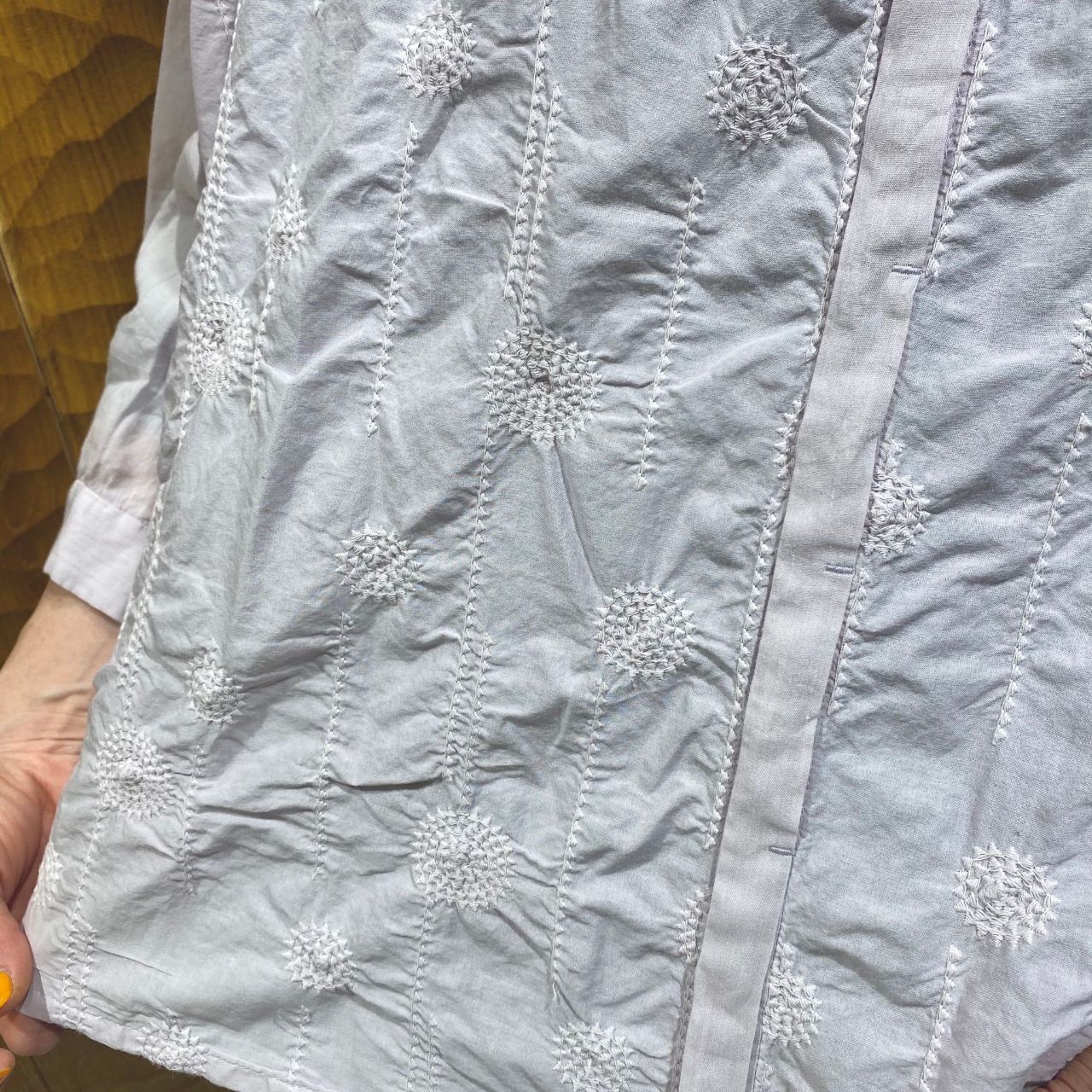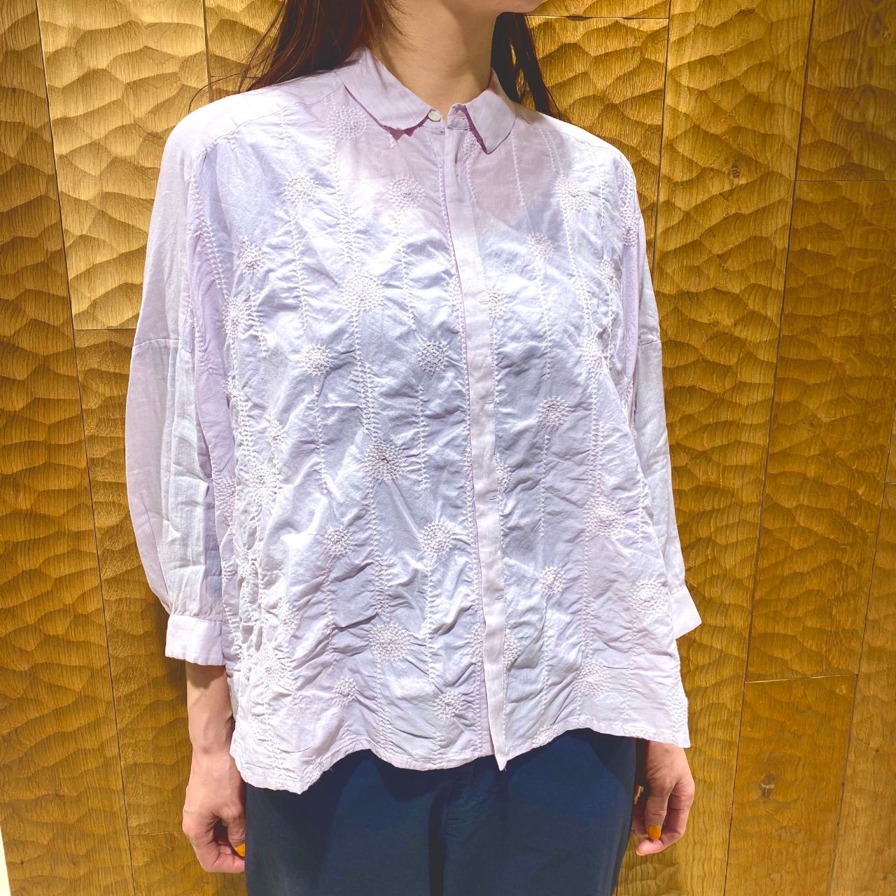 こちらのブラウスは細かい幾何学柄の刺繍がさりげなく入っている