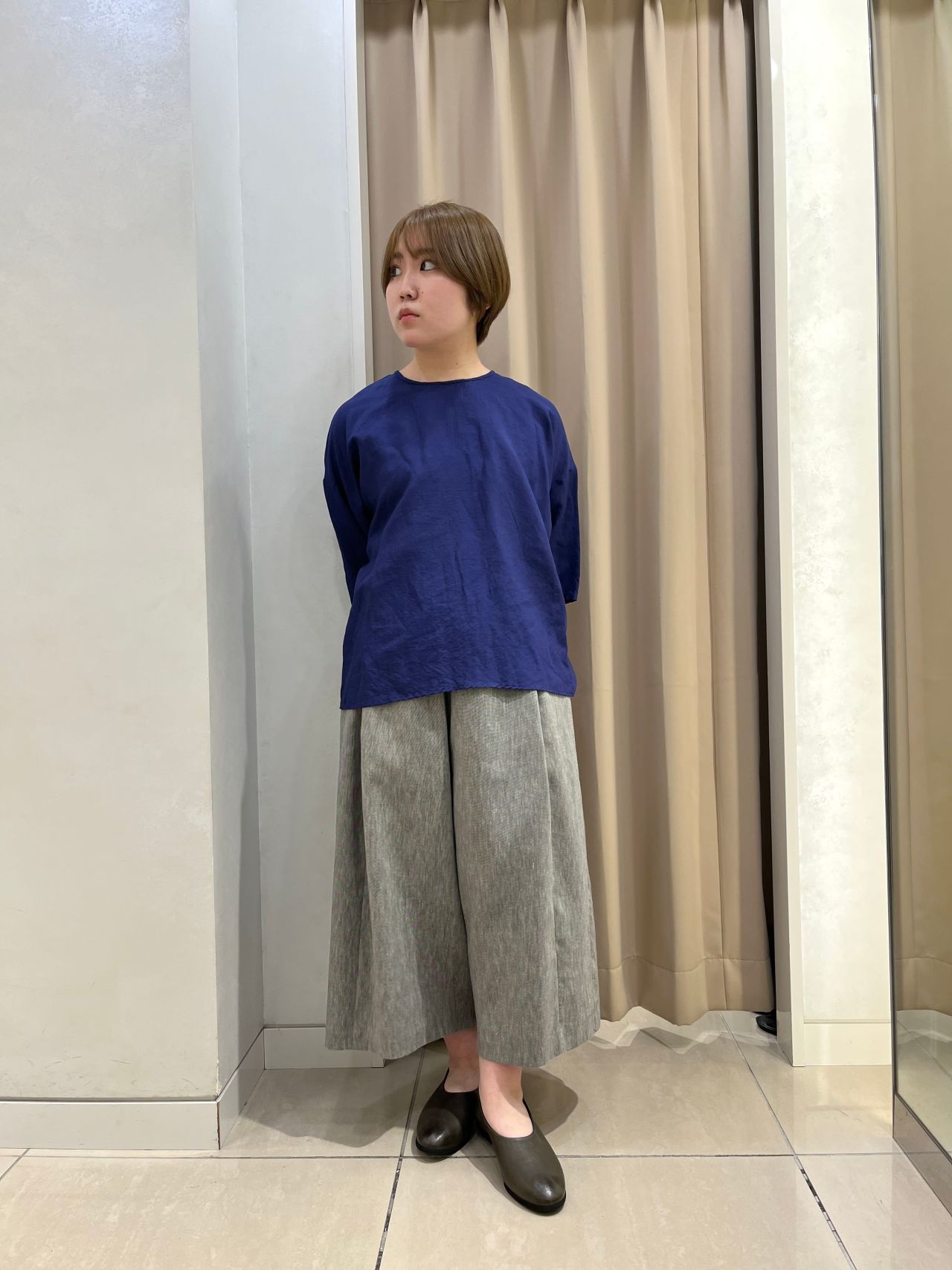 ラピスラズリとブラックシリカで染めた、光沢感のあるラミーのブラウスです。