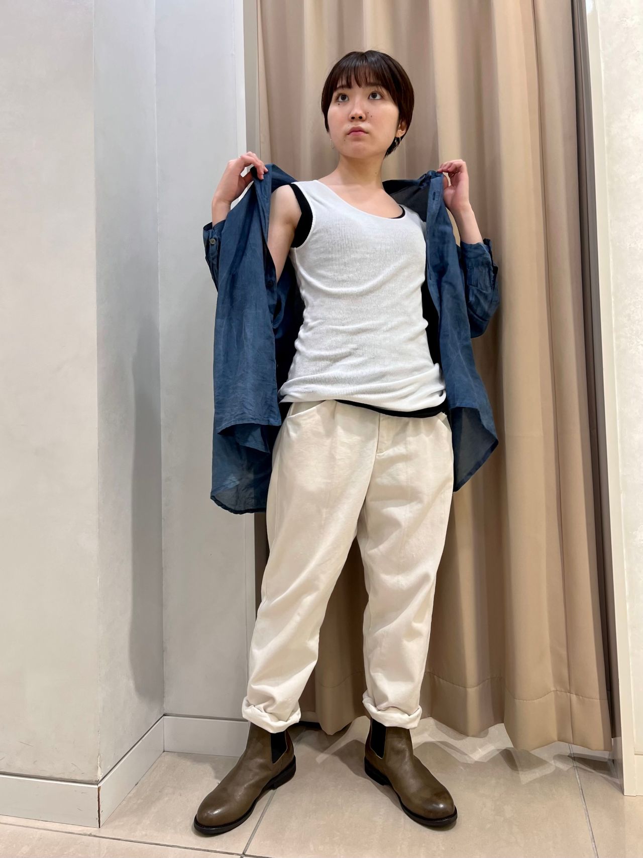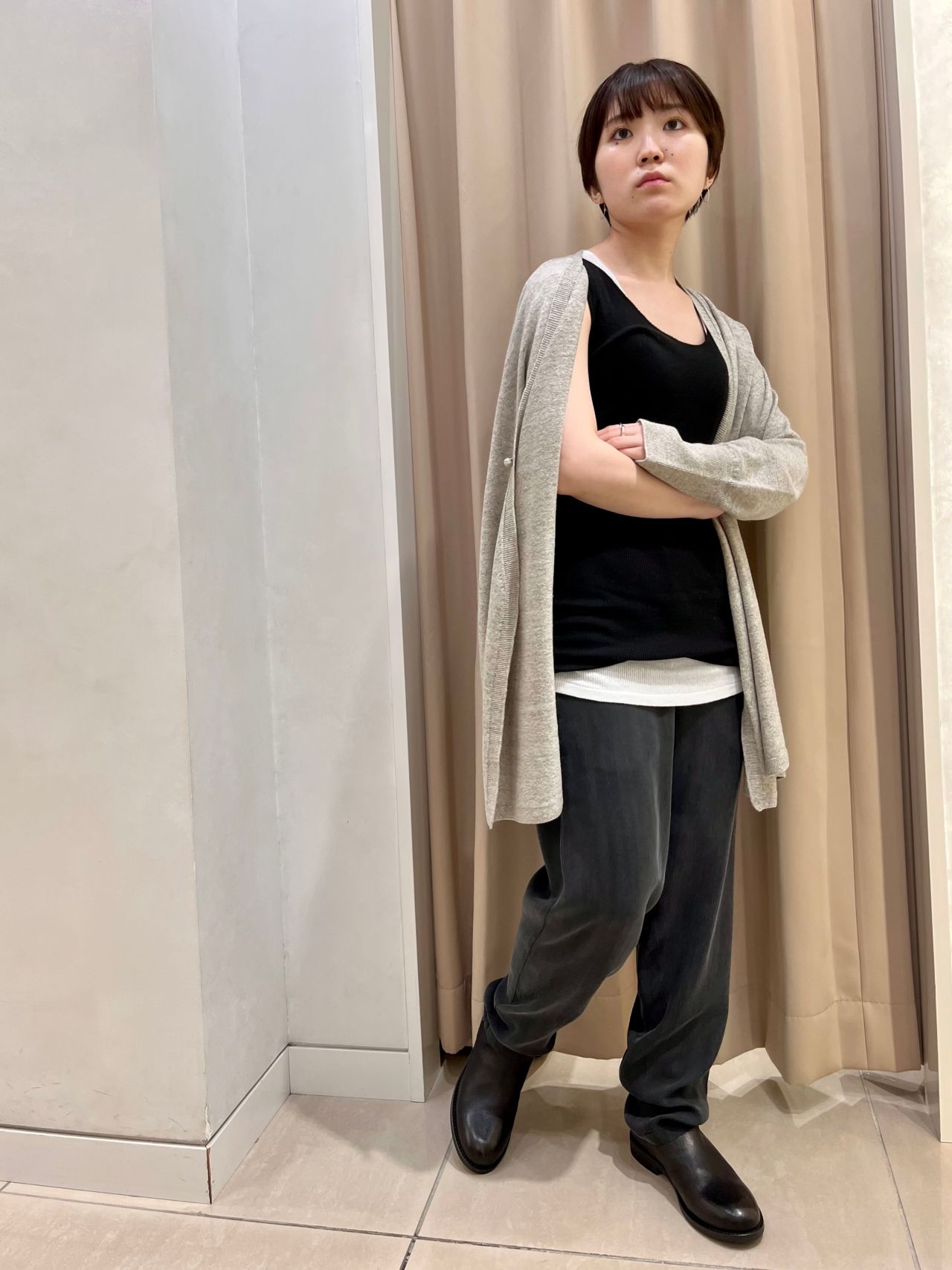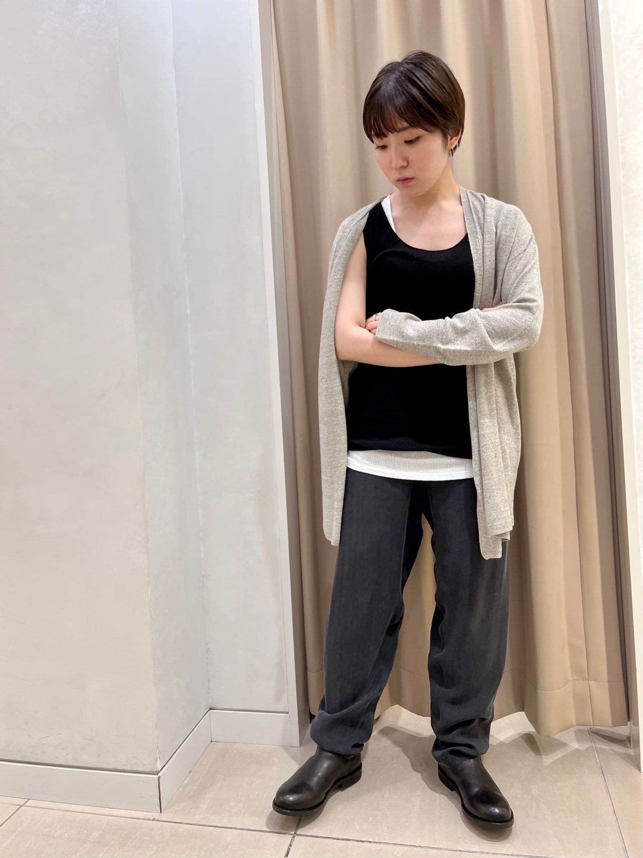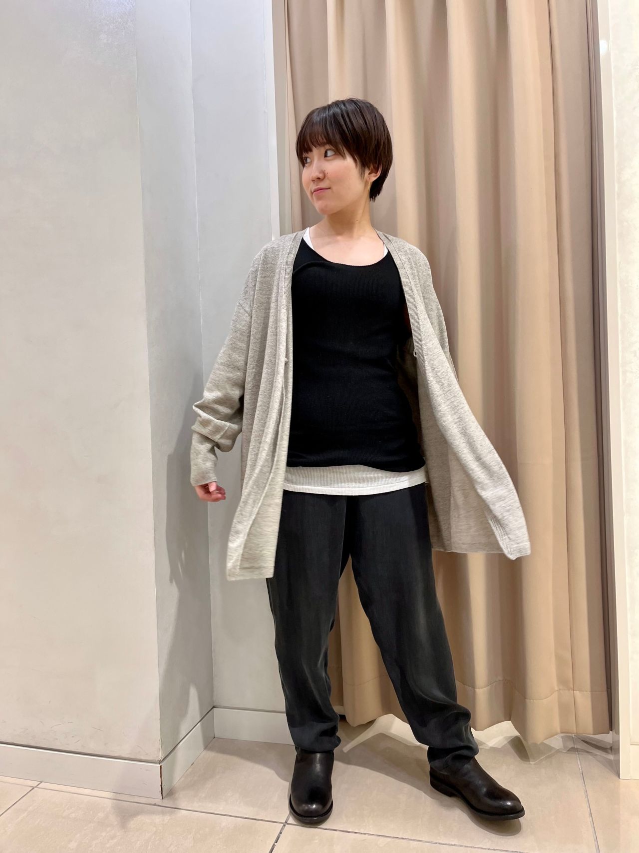 カーディガンを合わせてラフな雰囲気など