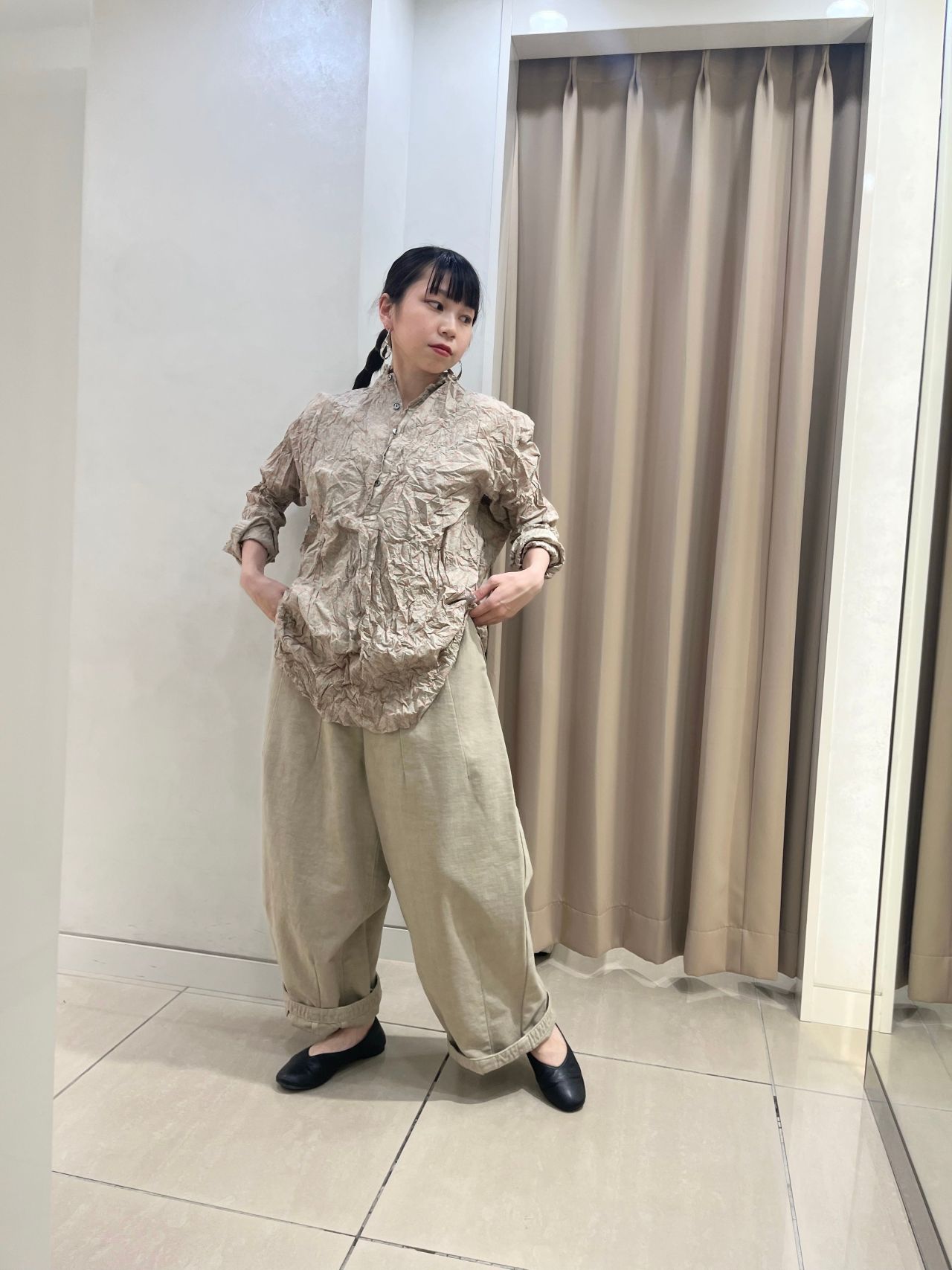 光沢感のある綿素材のバルーンパンツを合わせたナチュラルなコーディネート。
