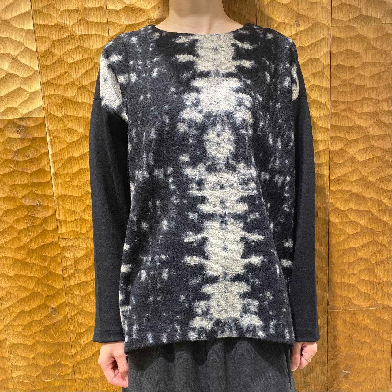 前身頃の大胆なジャガード柄は、パドカレオリジナル。
