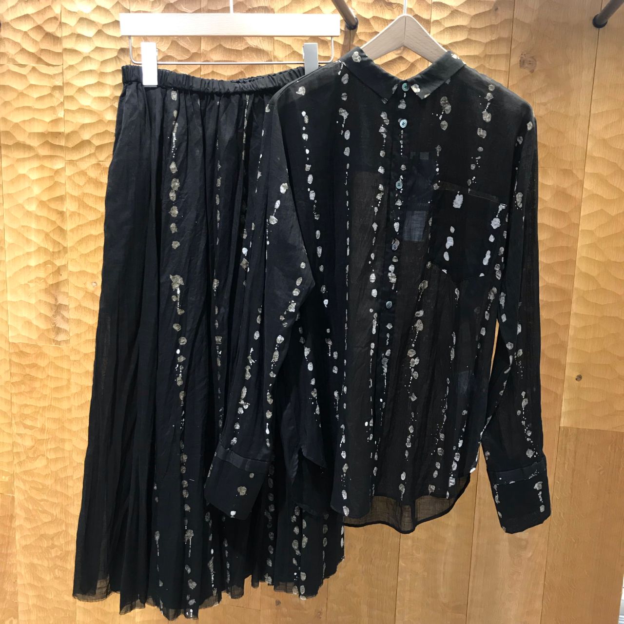 水滴のような柄になるように蝋(ロウ)を垂らして一点ずつ溶かして仕上げたローケツ染めを施した、パドカレの秋らしい