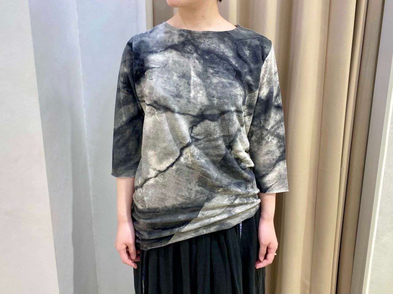 まるで大理石のような柄のカットソーがコーディネートをよりオシャレに見せてくれます。