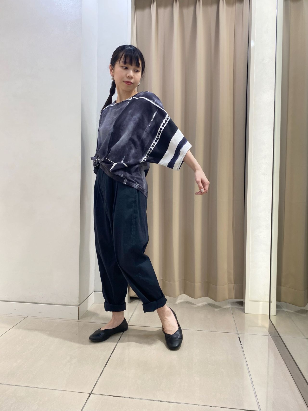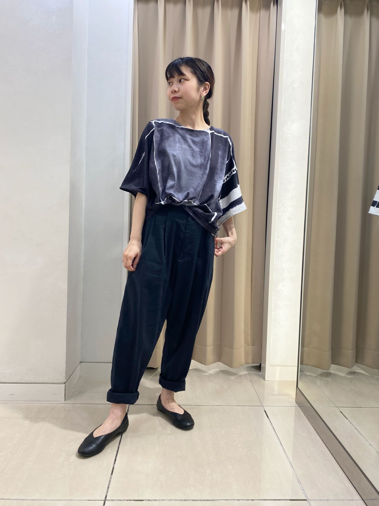 大胆なスクエア柄が目を引くオーバーサイズのカットソーに、ストレッチ性のある綿麻素材のパンツを
