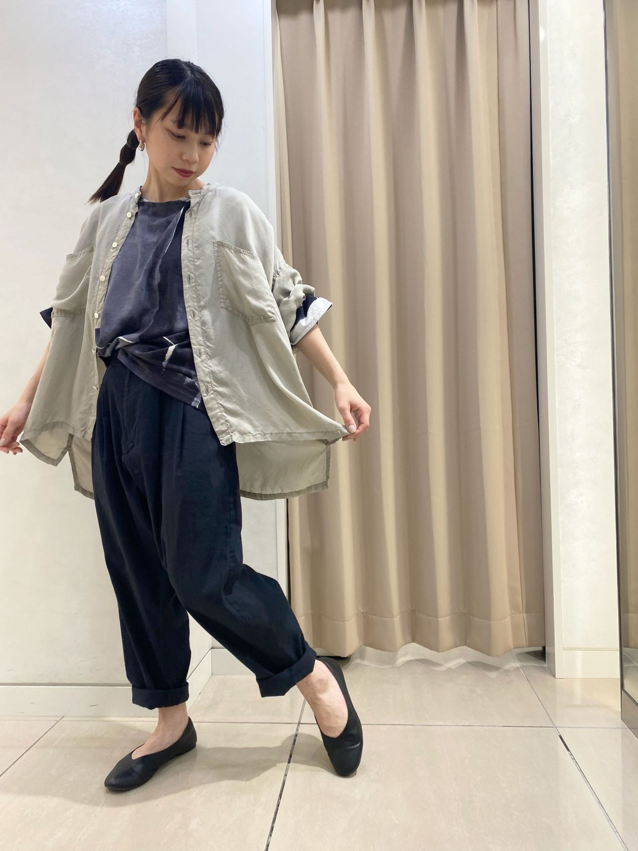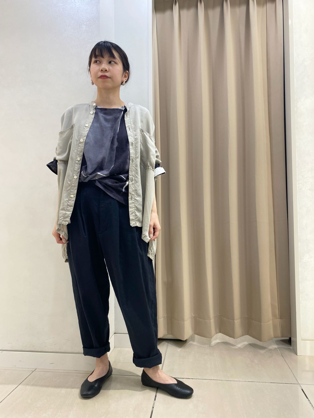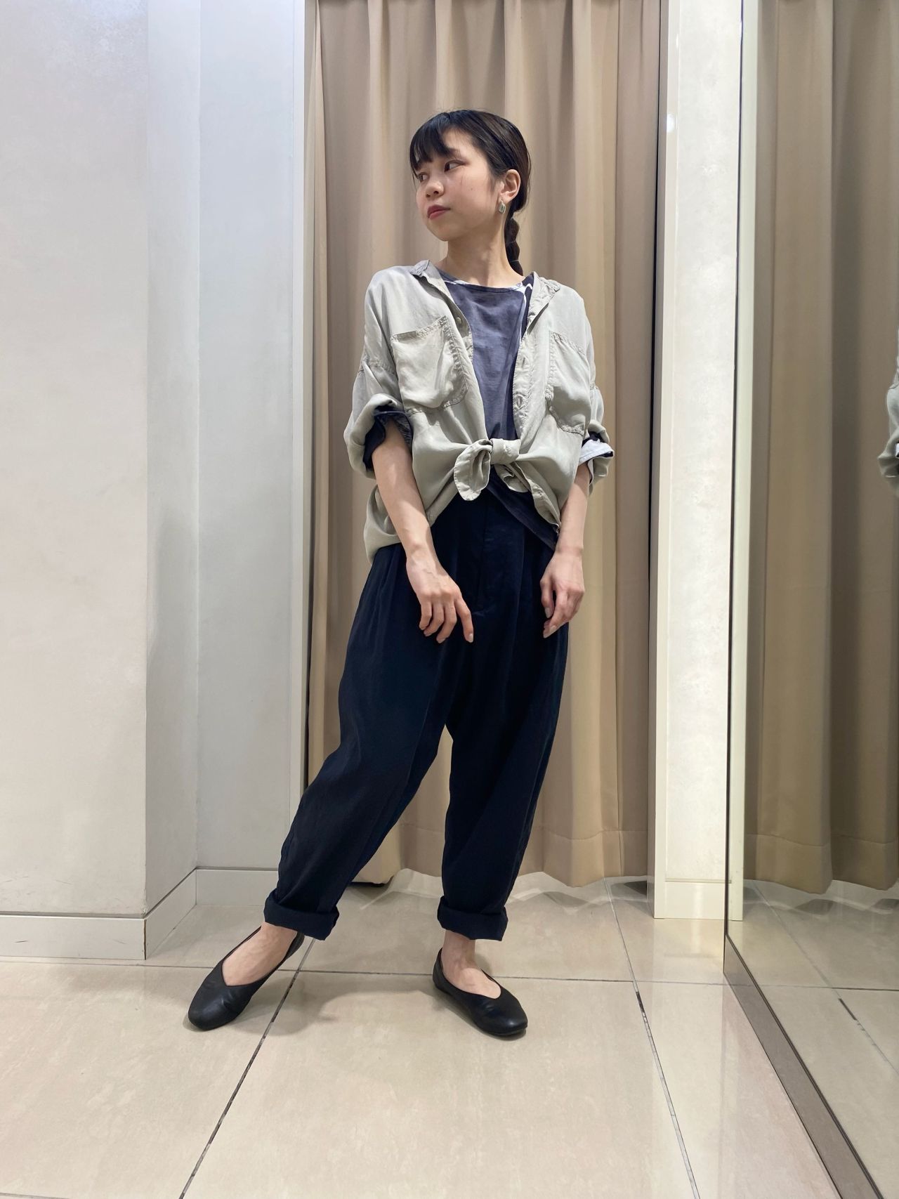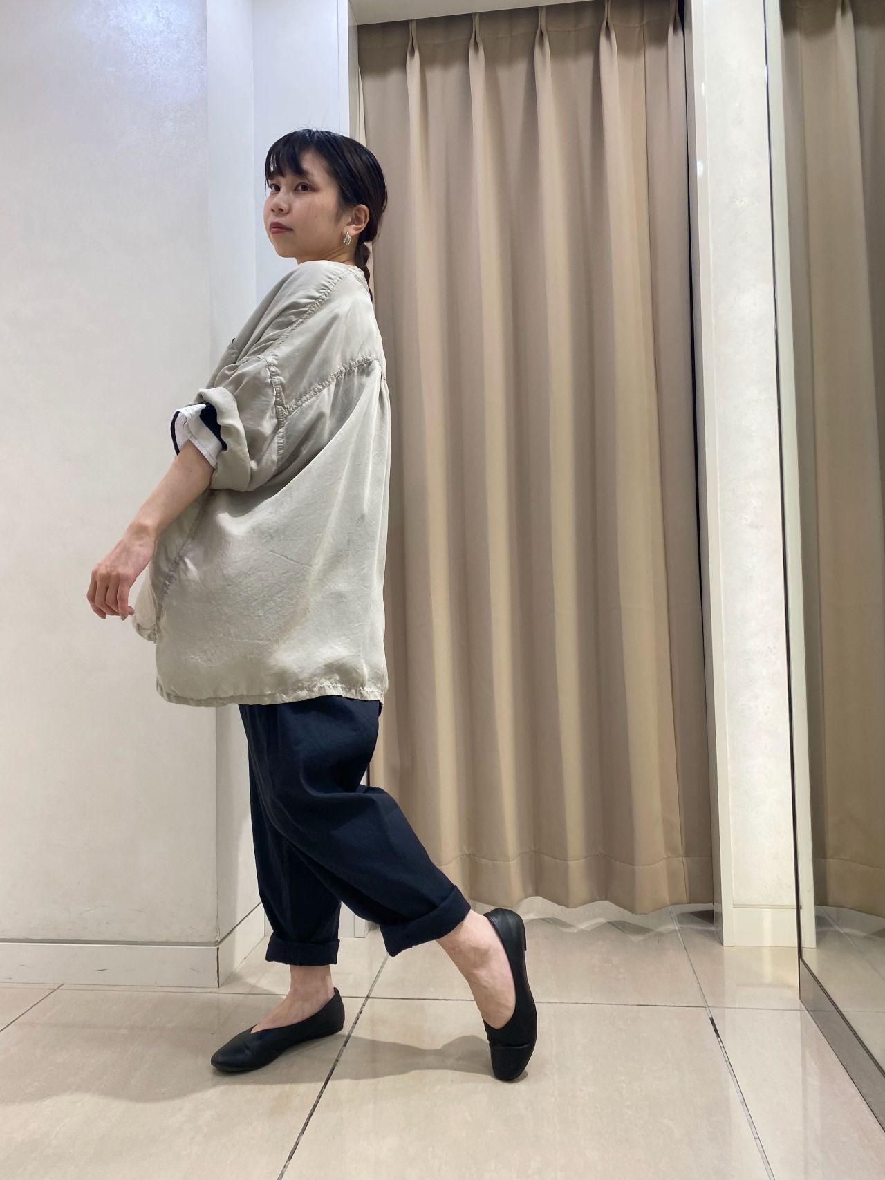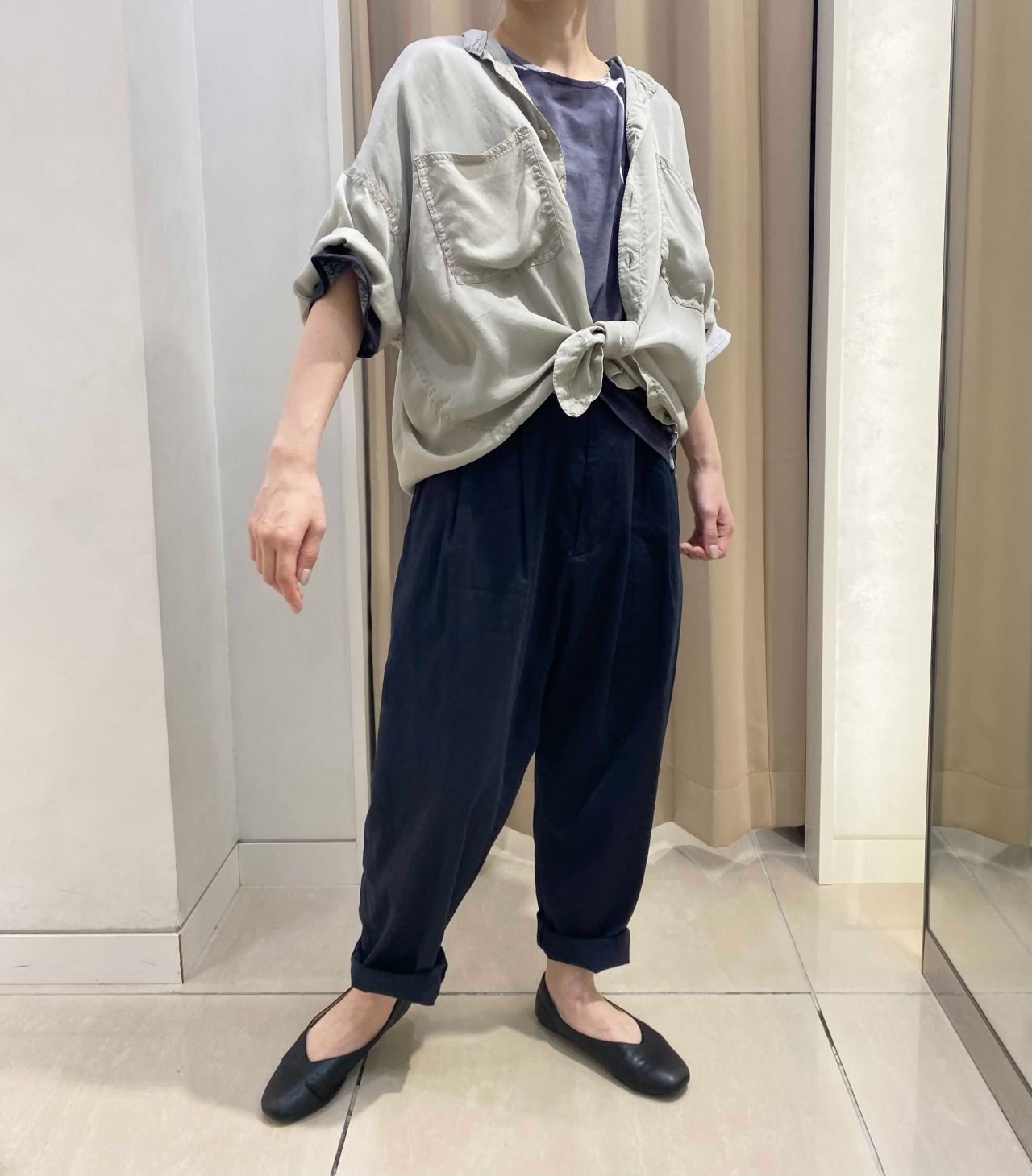 また、アウターの代わりに光沢感のあるキュプラ素材のブラウスを羽織り、大人カジュアルなスタイリングに。