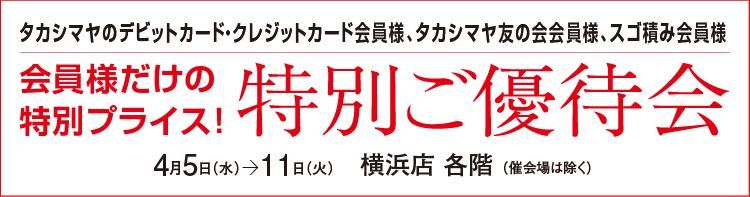 期間中、髙島屋カード・友の会カードお買い物頂くと店内商品10%OFFでお求めいただけます。