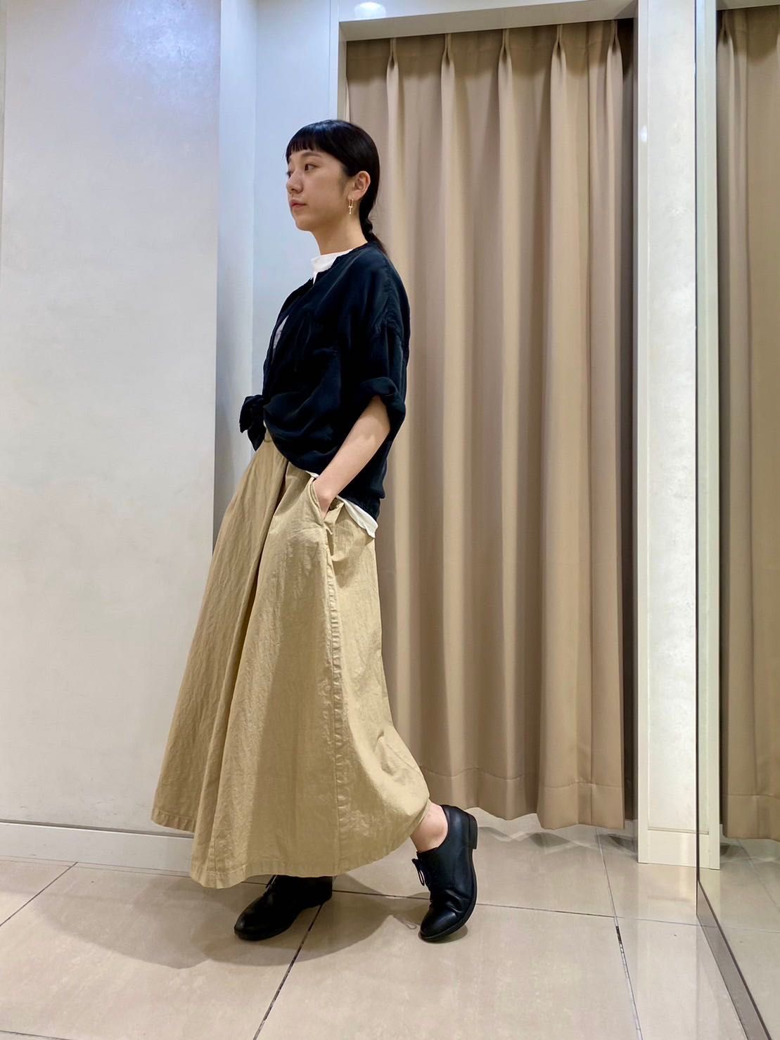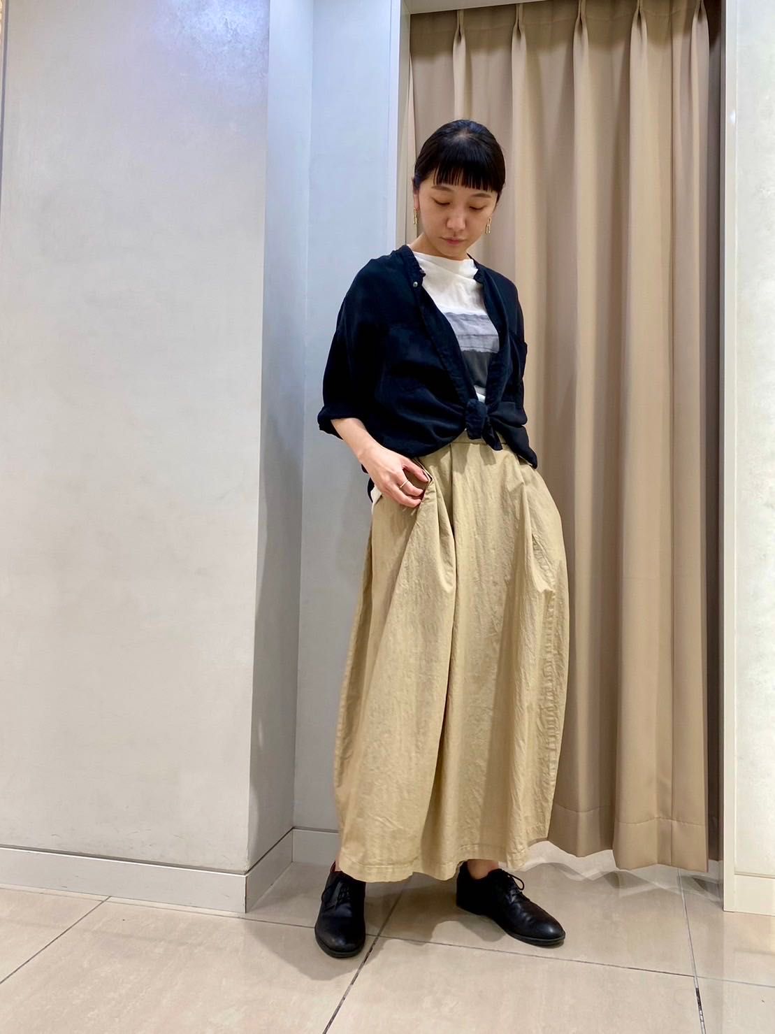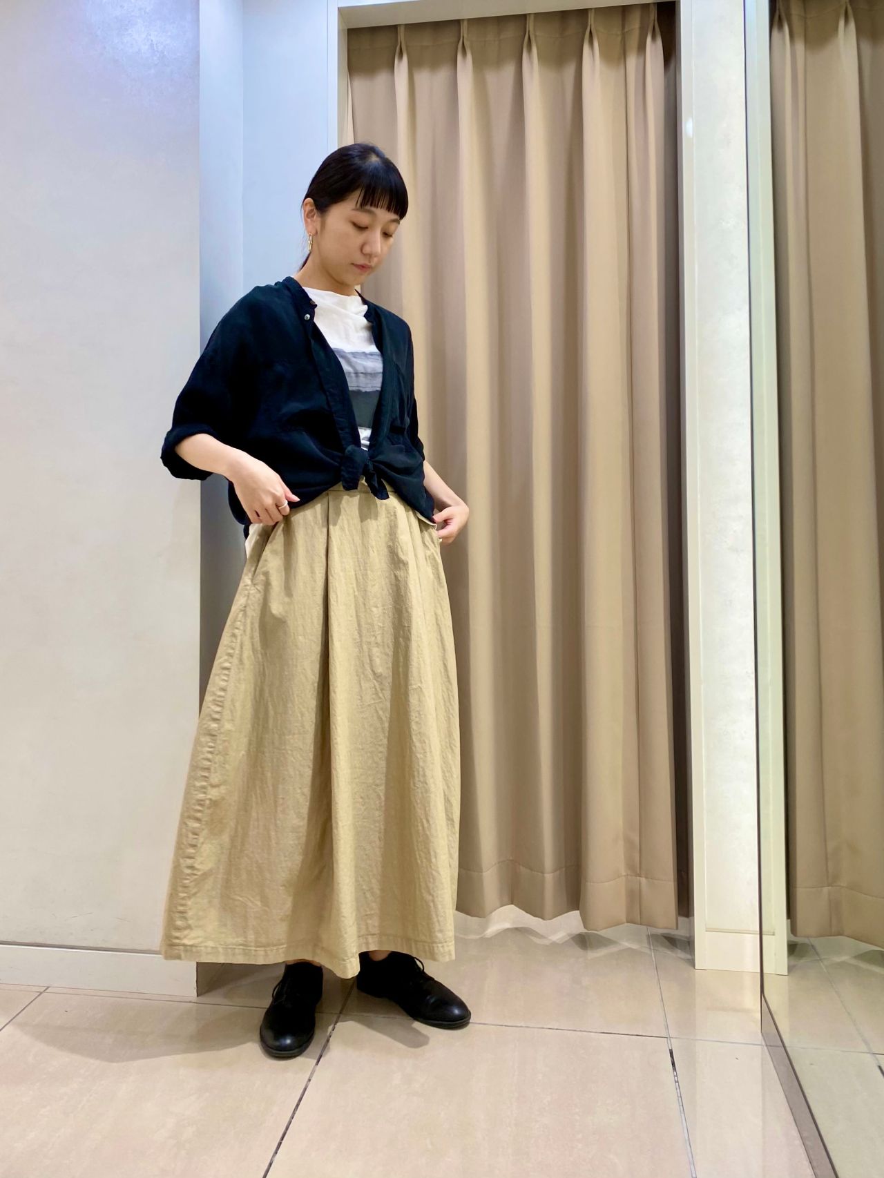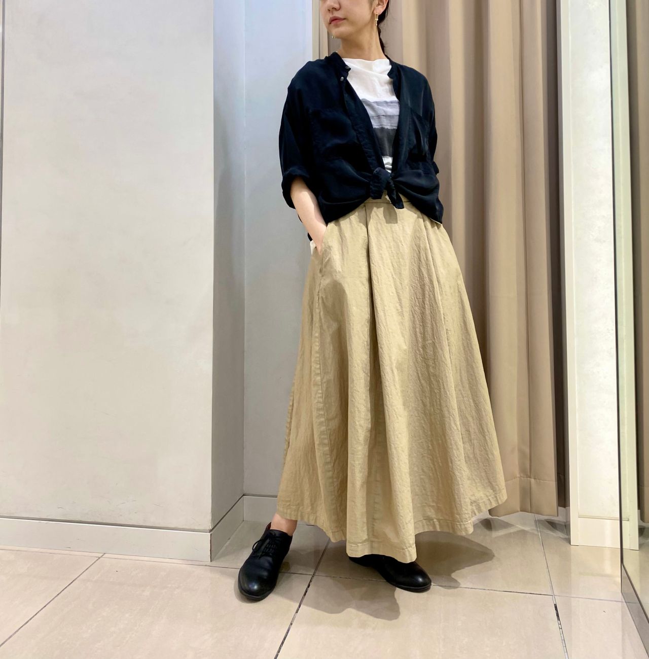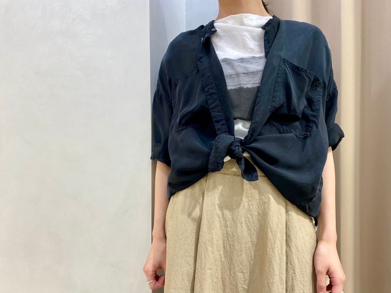 ブラウスの裾を敢えて結び、カジュアル過ぎないリラックススタイルに。