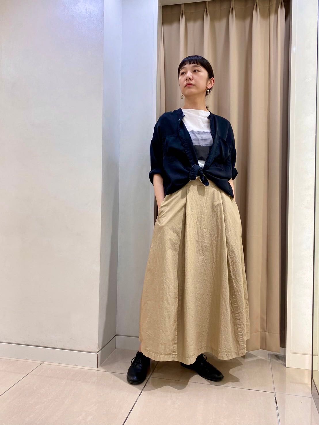 ヴィンテージ感のあるボーダー柄のオフネックTシャツに、光沢感のあるシャツブラウスとコクーンシルエットのロングスカートを合わせた、初夏を感じるコーディネート。