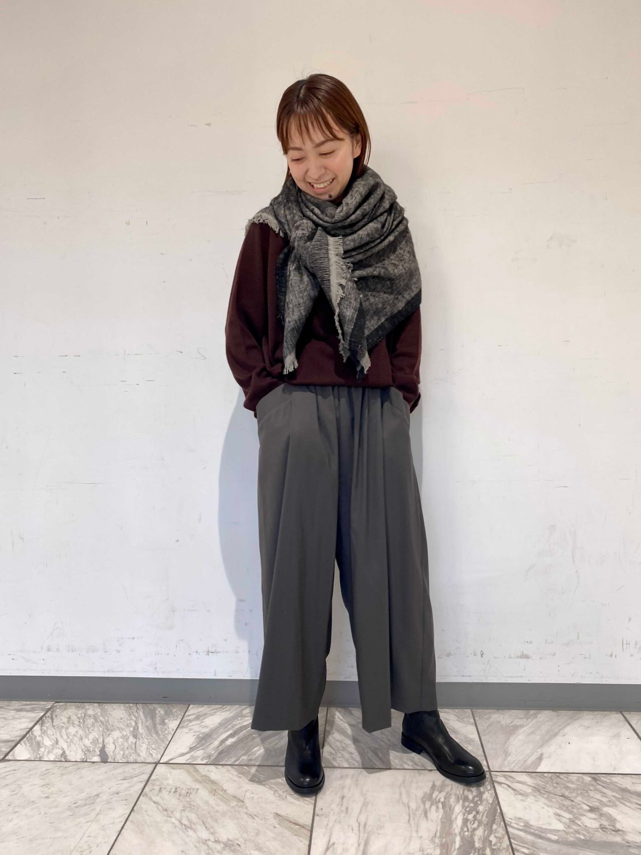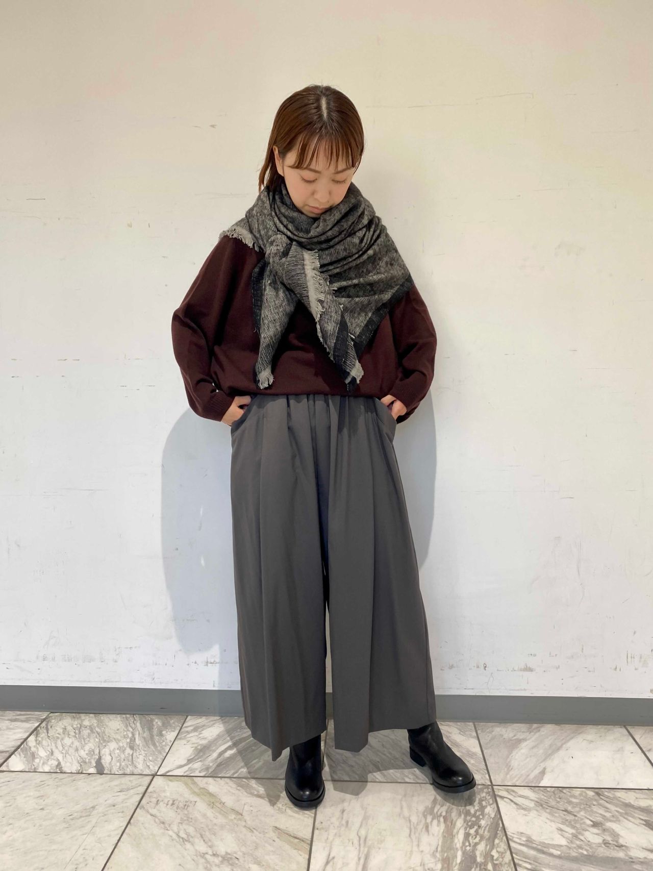 今回チョイスしたブラウンは、赤みのある深い色合い。普段色物を着ないという方でも、挑戦しやすい色です。