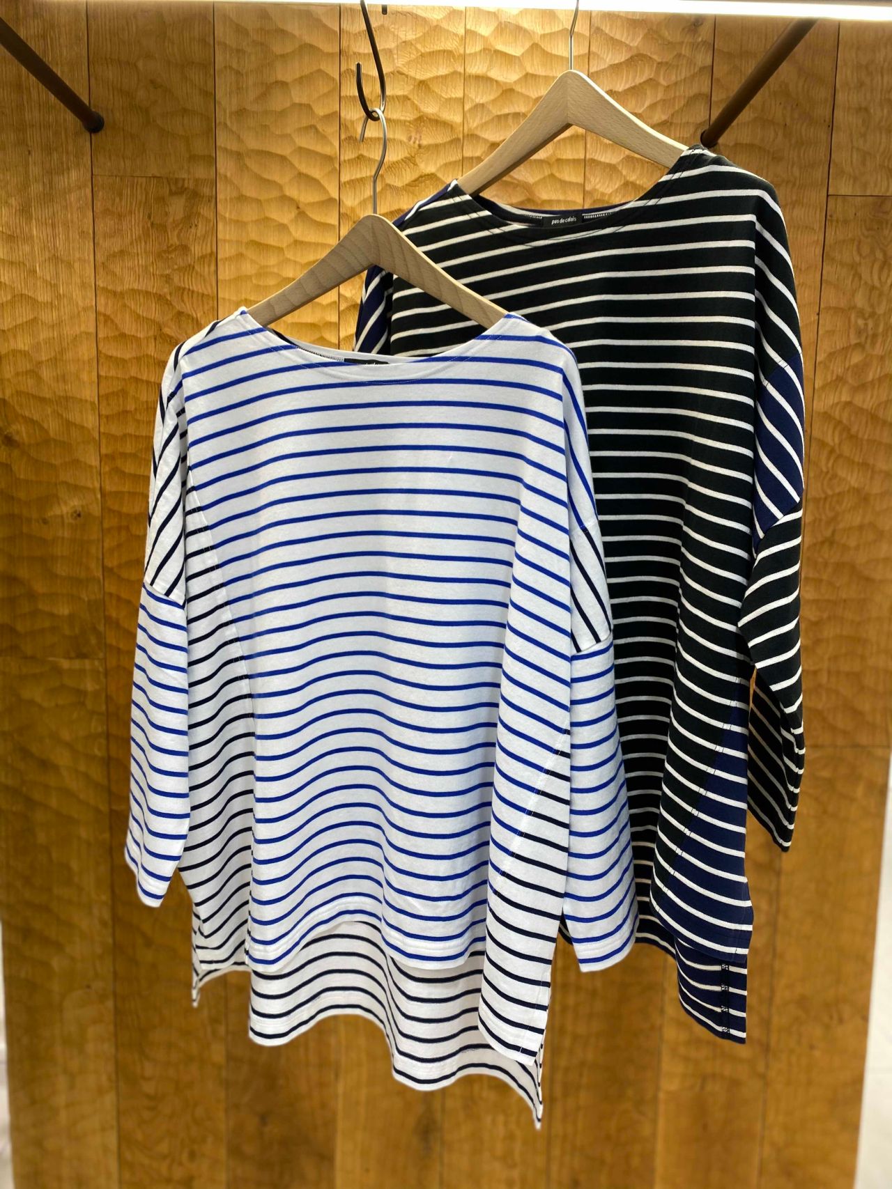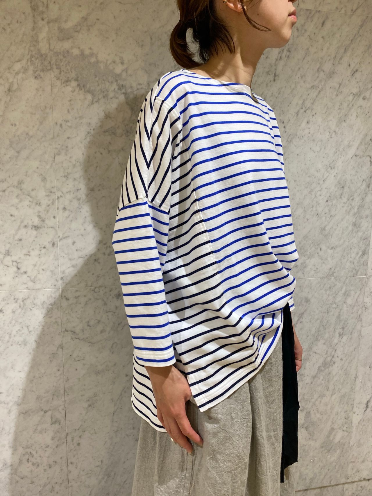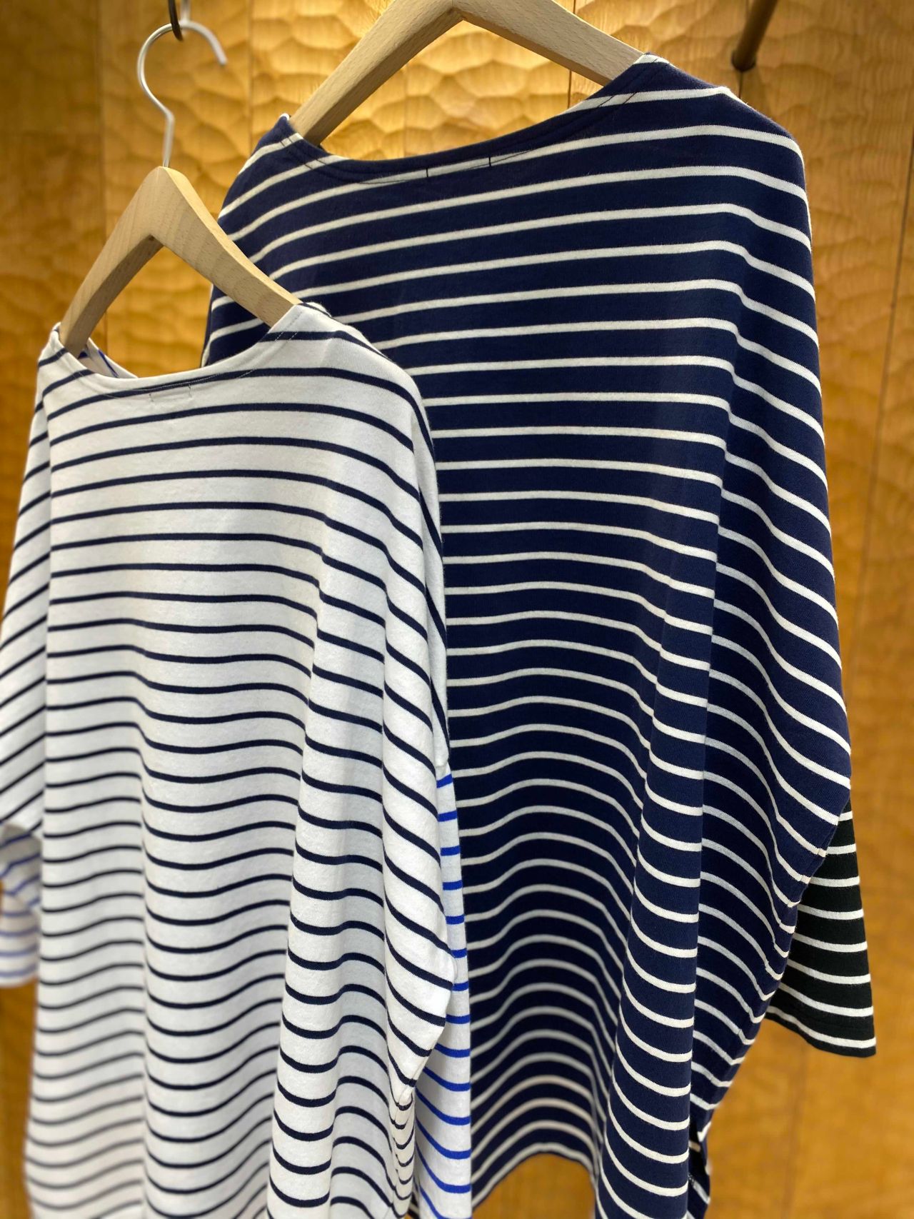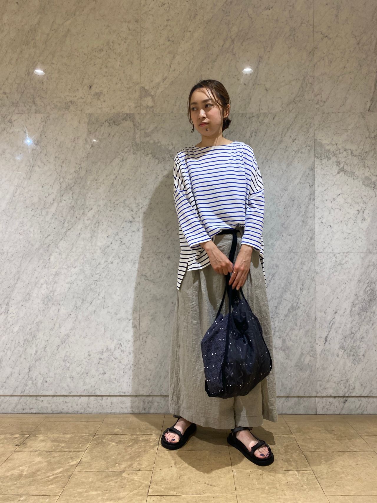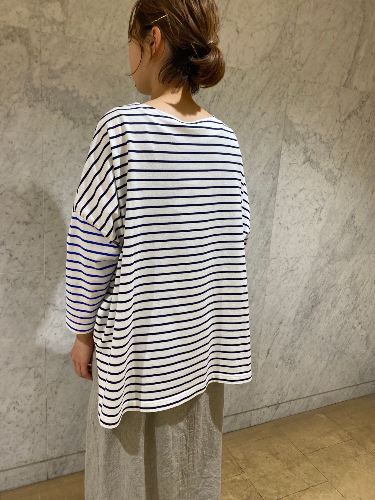 定番のボーダーにあえて柄のバックを合わせたコーディネート。