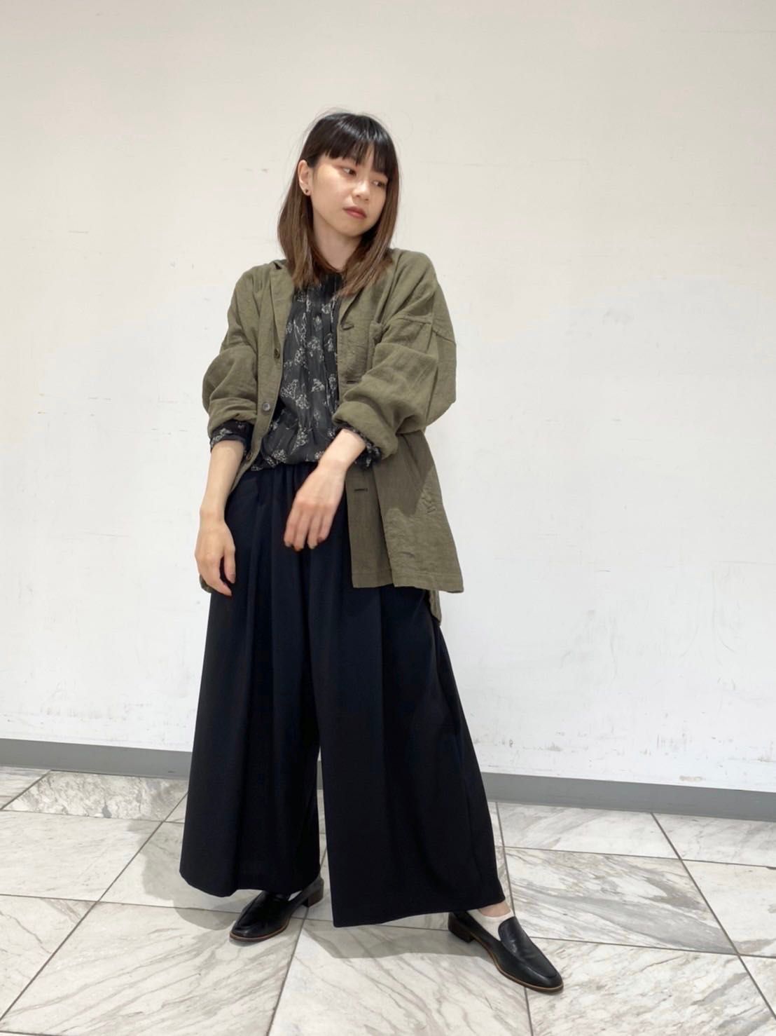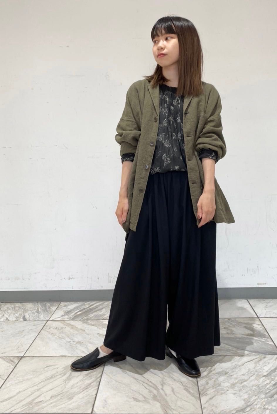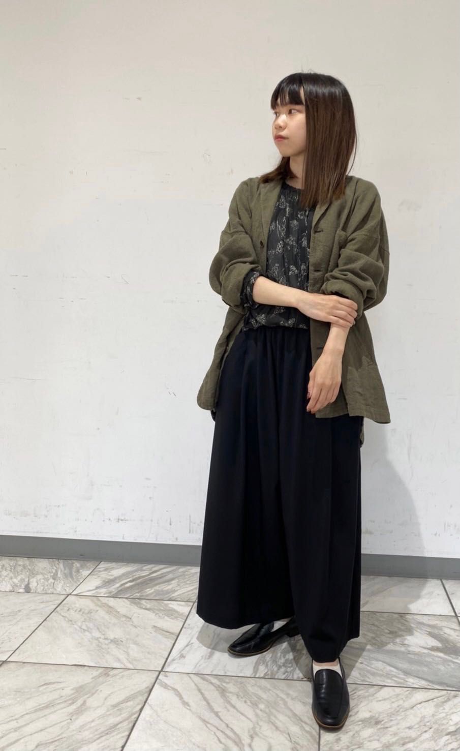 全体に柔らかさが出て初秋にふさわしいコーディネートに。