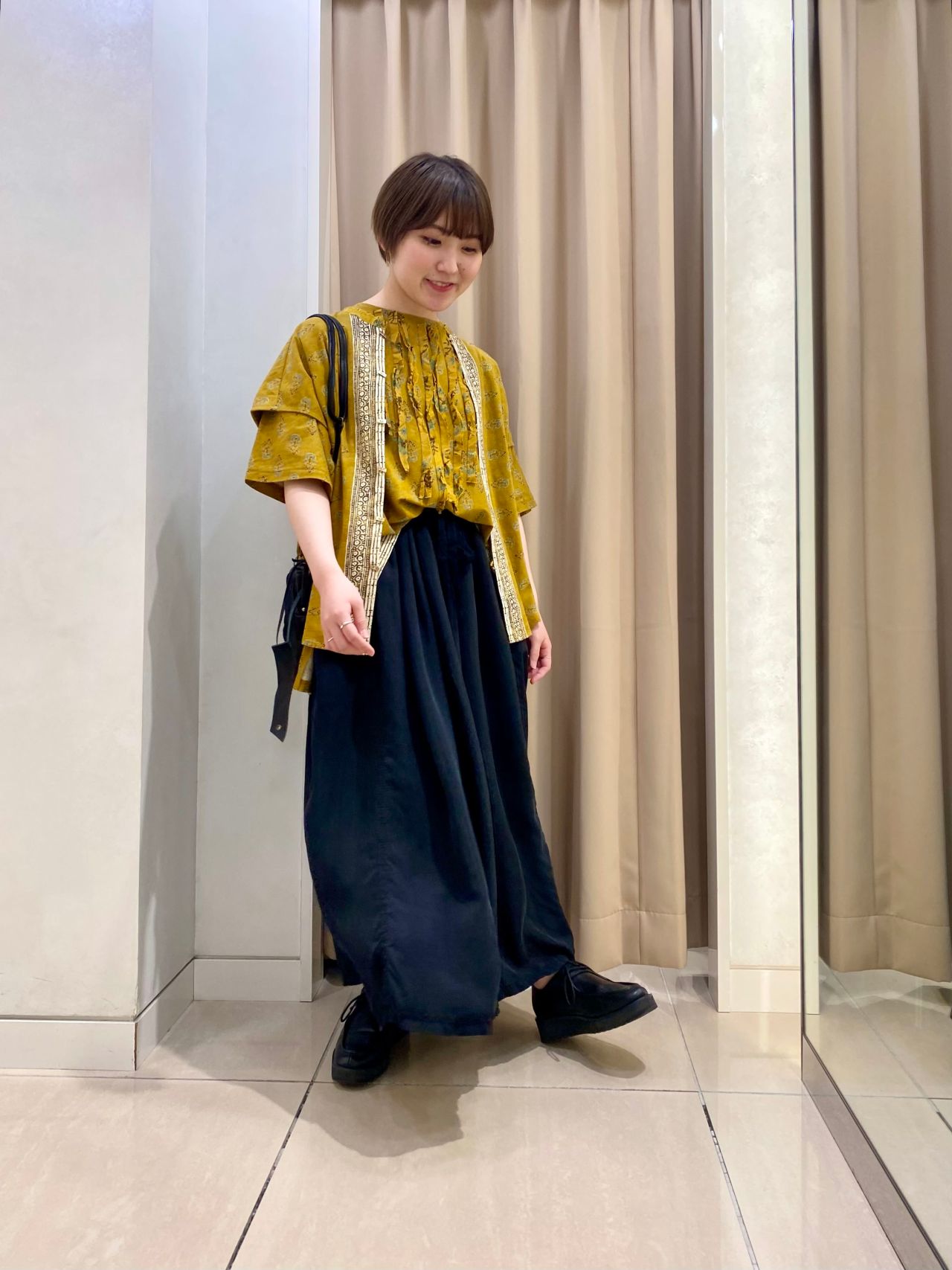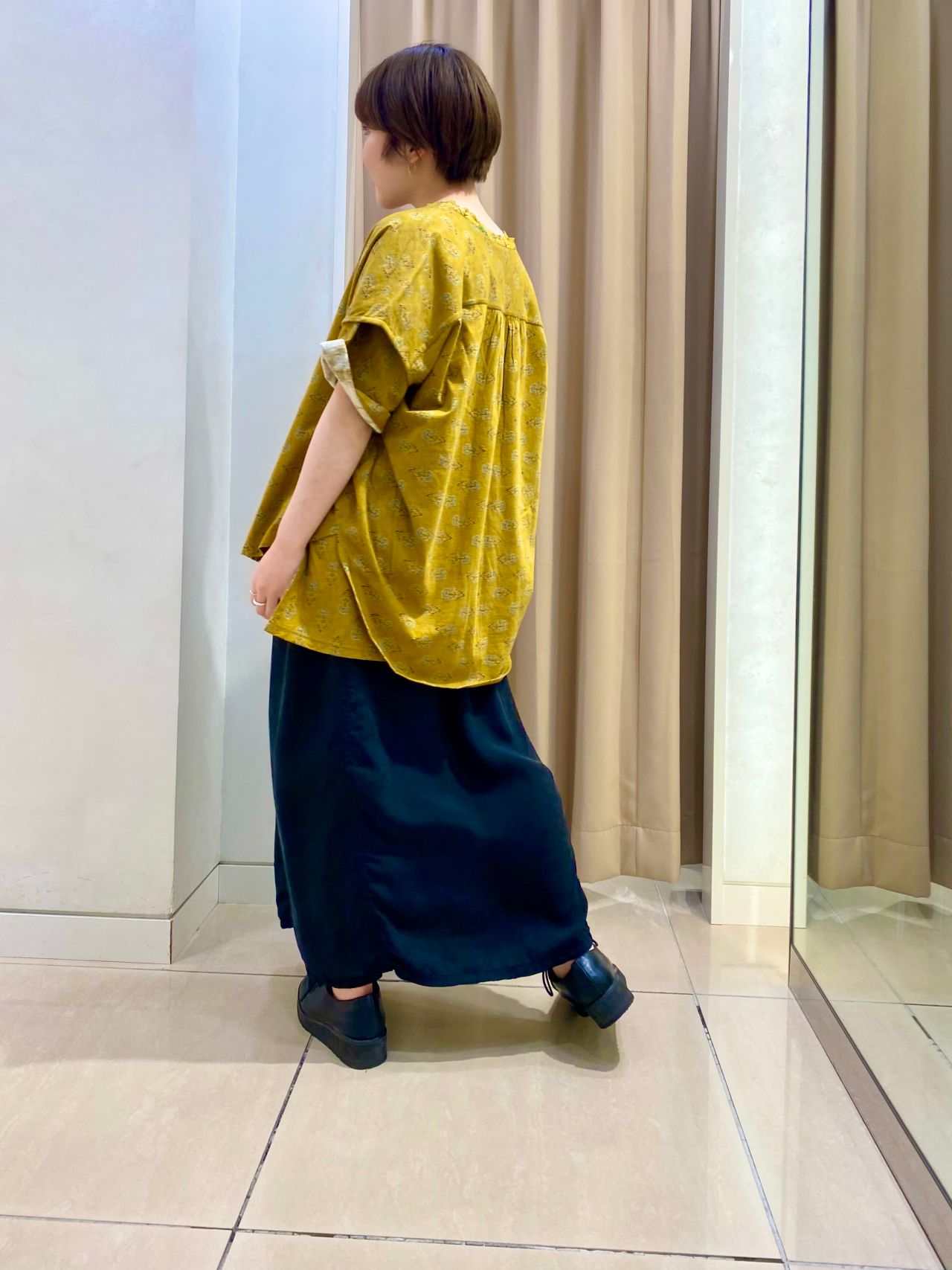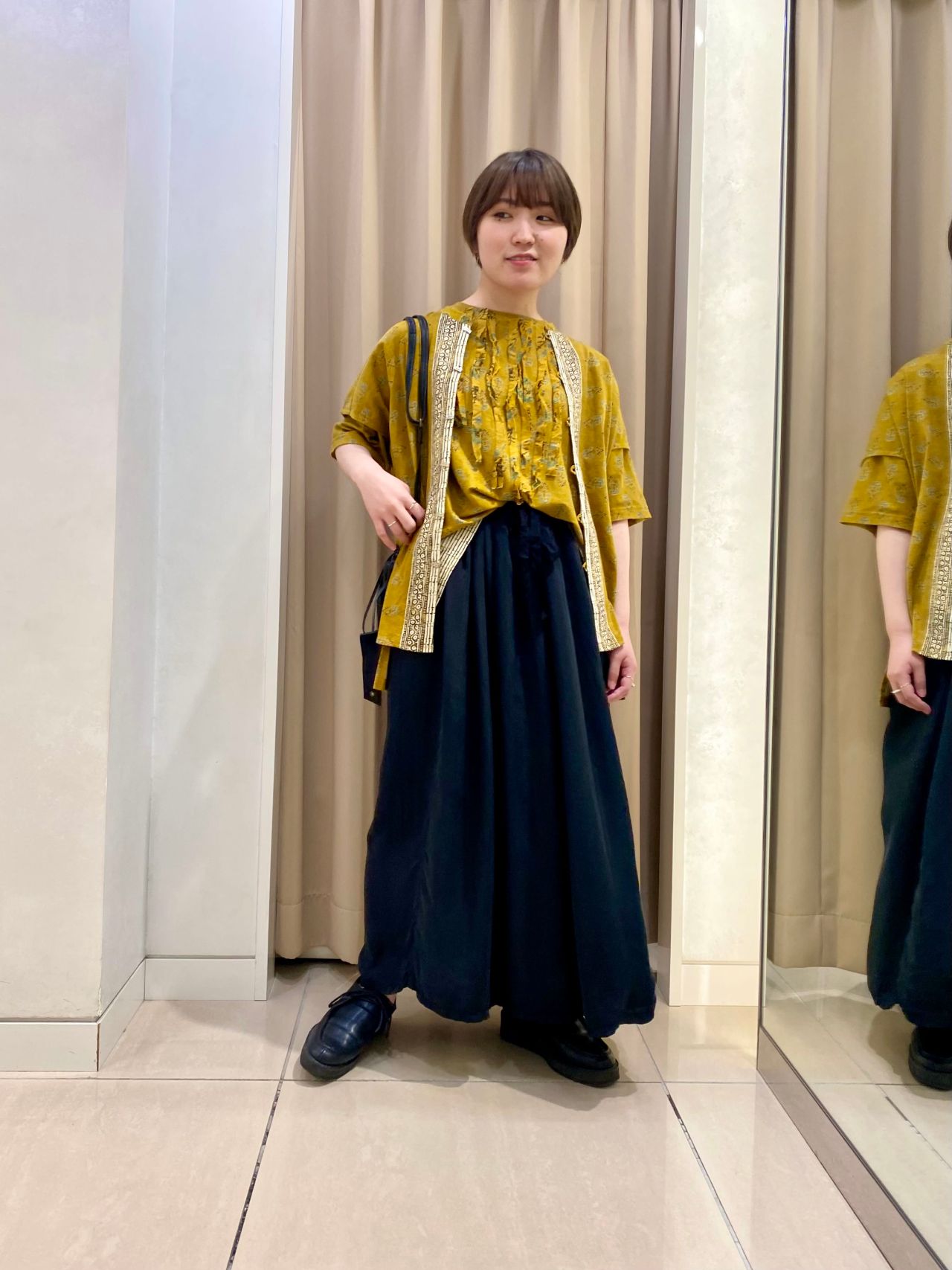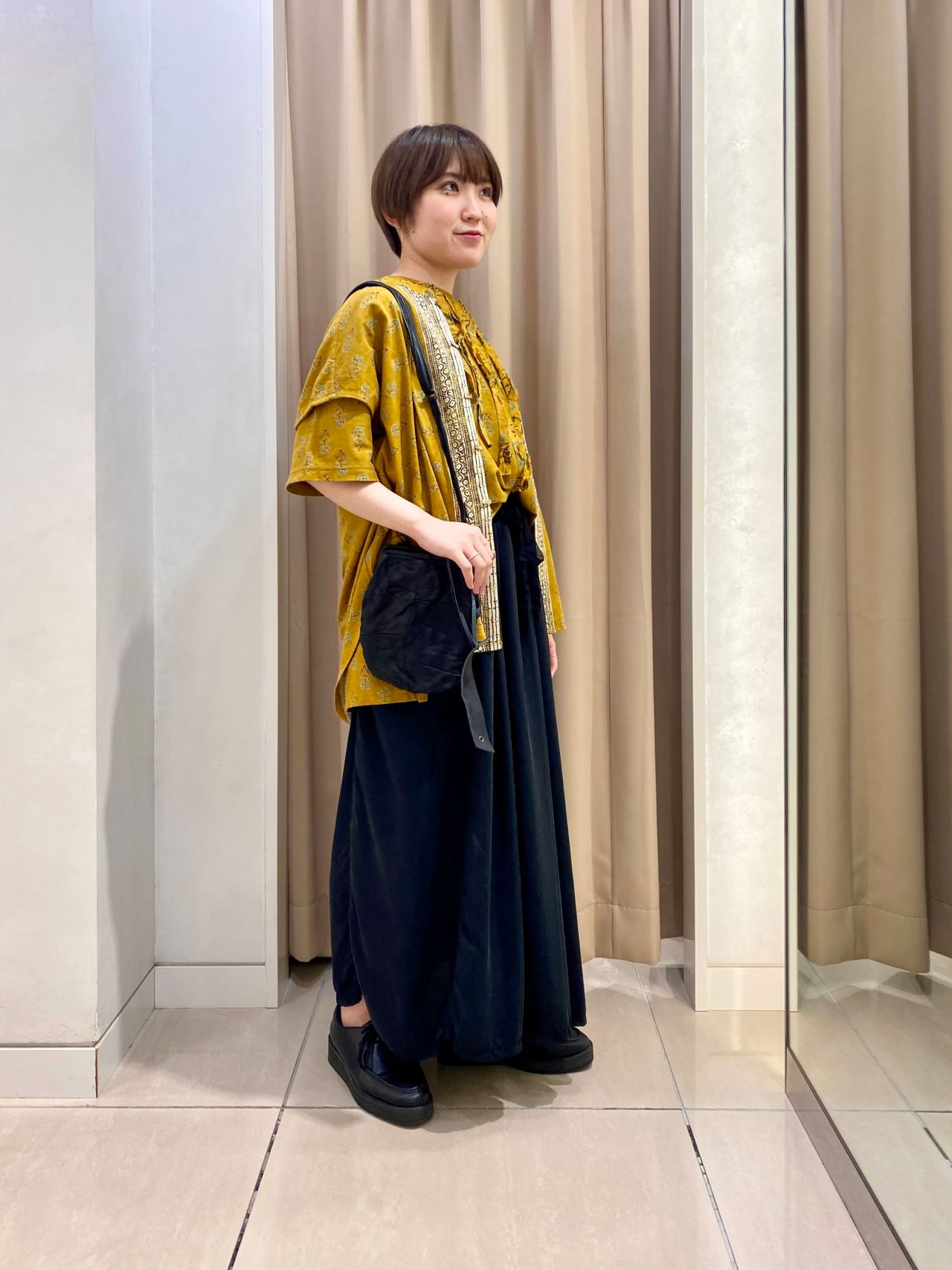 パキッとした黄色に、光沢感のあるブラックのスカートで