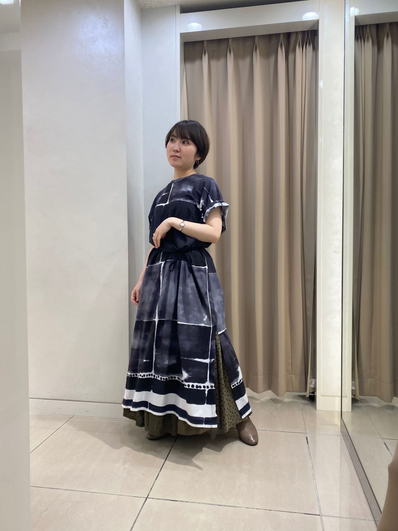 パッチワークで切り替えたボリュームのあるスカートを合わせた女性らしいスタイリング。