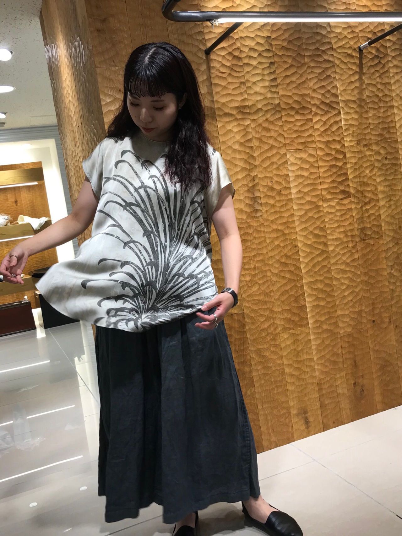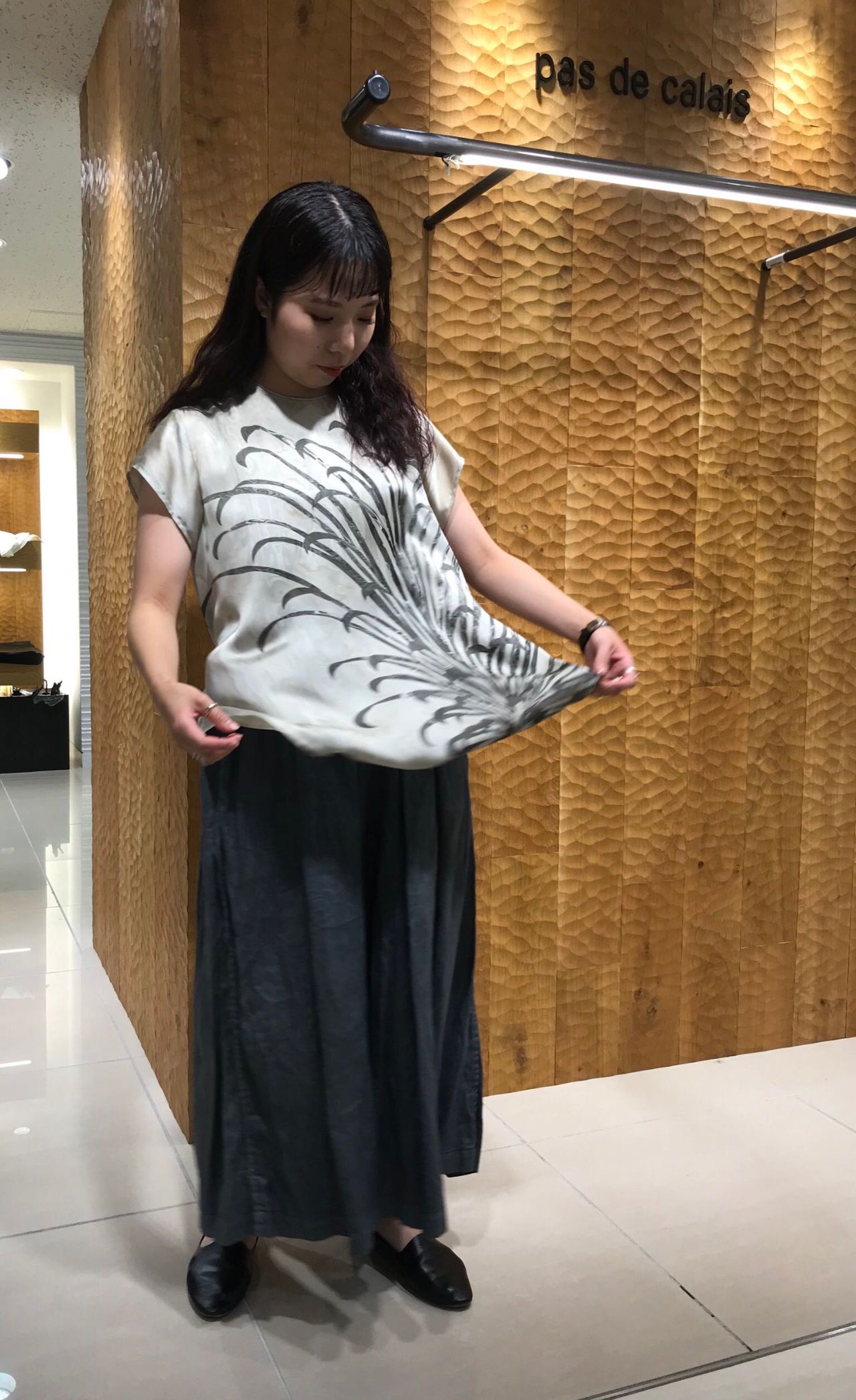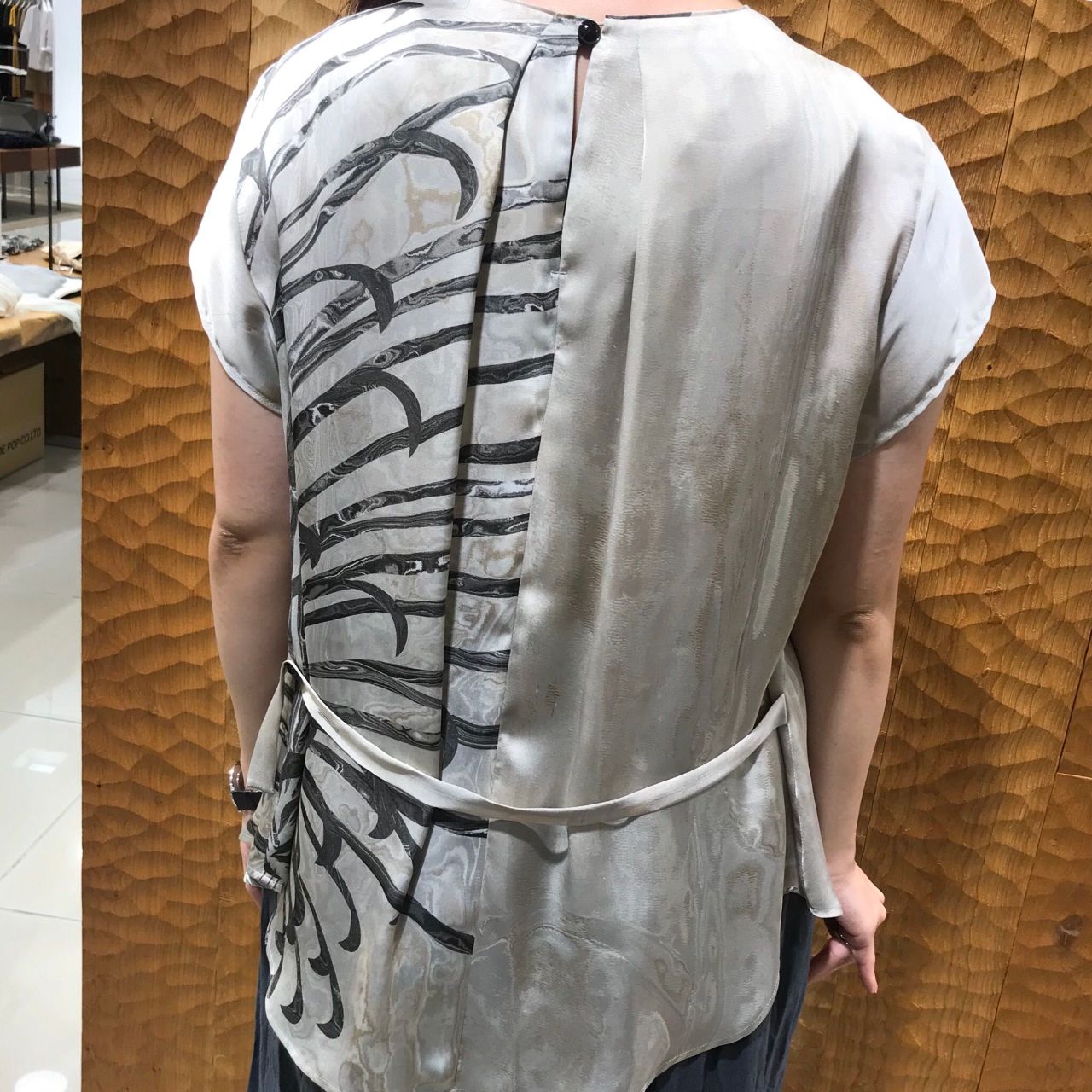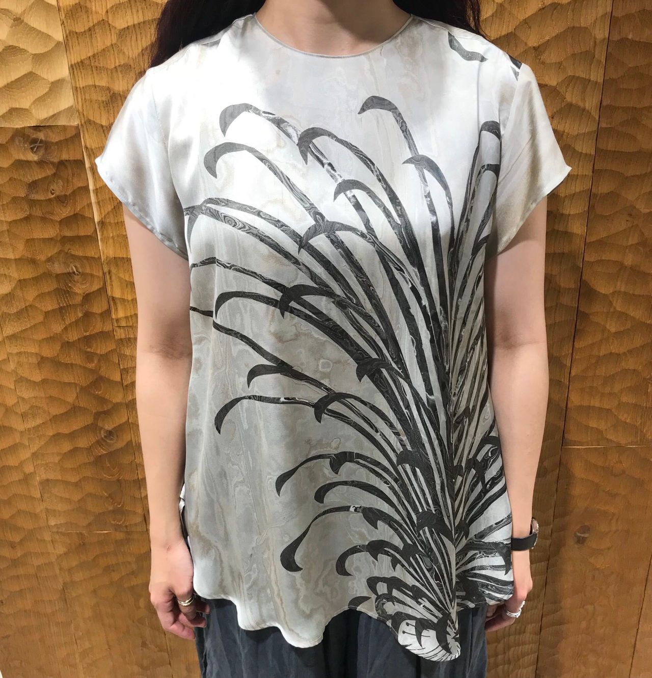 しだれ菊に見立ててプリントした、マーブルプリントという技法で染めたブラウスとなっています。